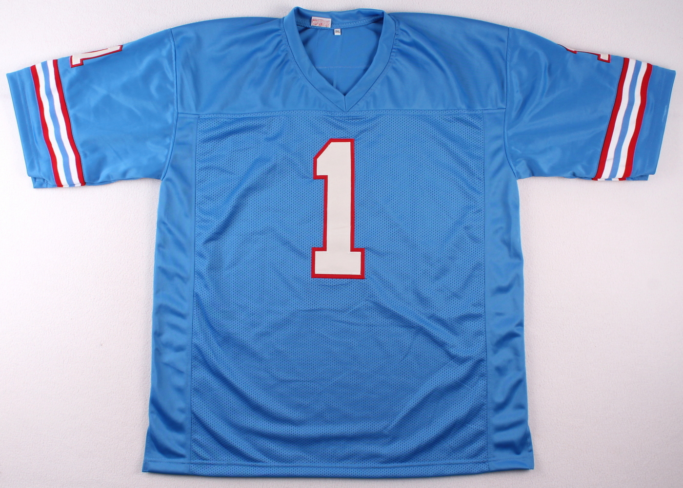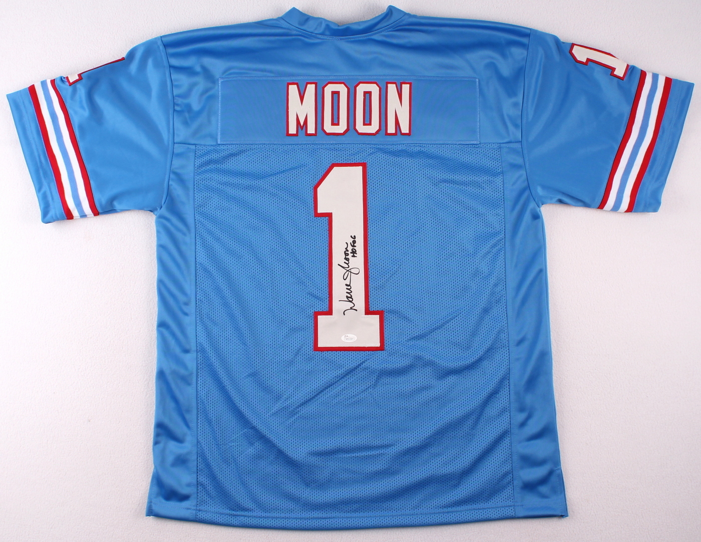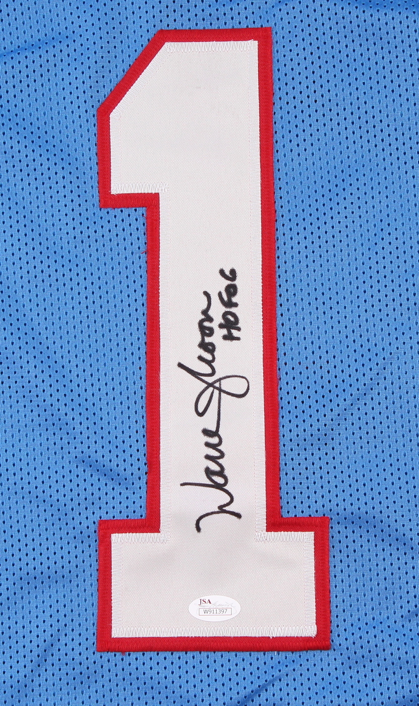 Custom on-field style jersey. Everything is sewn on, size XL. Hand-signed and inscribed in black felt tip pen by Warren Moon. The autograph includes an official James Spence Authentication (JSA) hologram and matching COA for authenticity purposes. The signing of this item was witnessed by JSA.