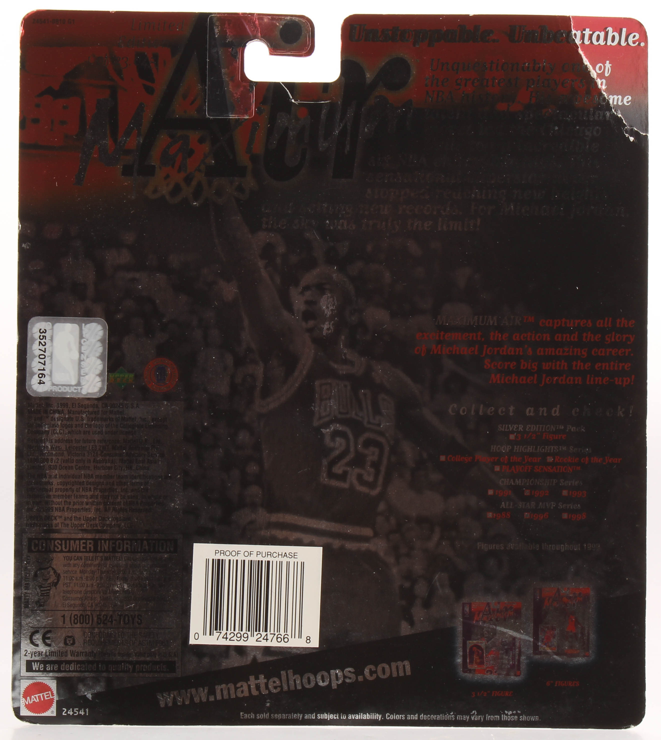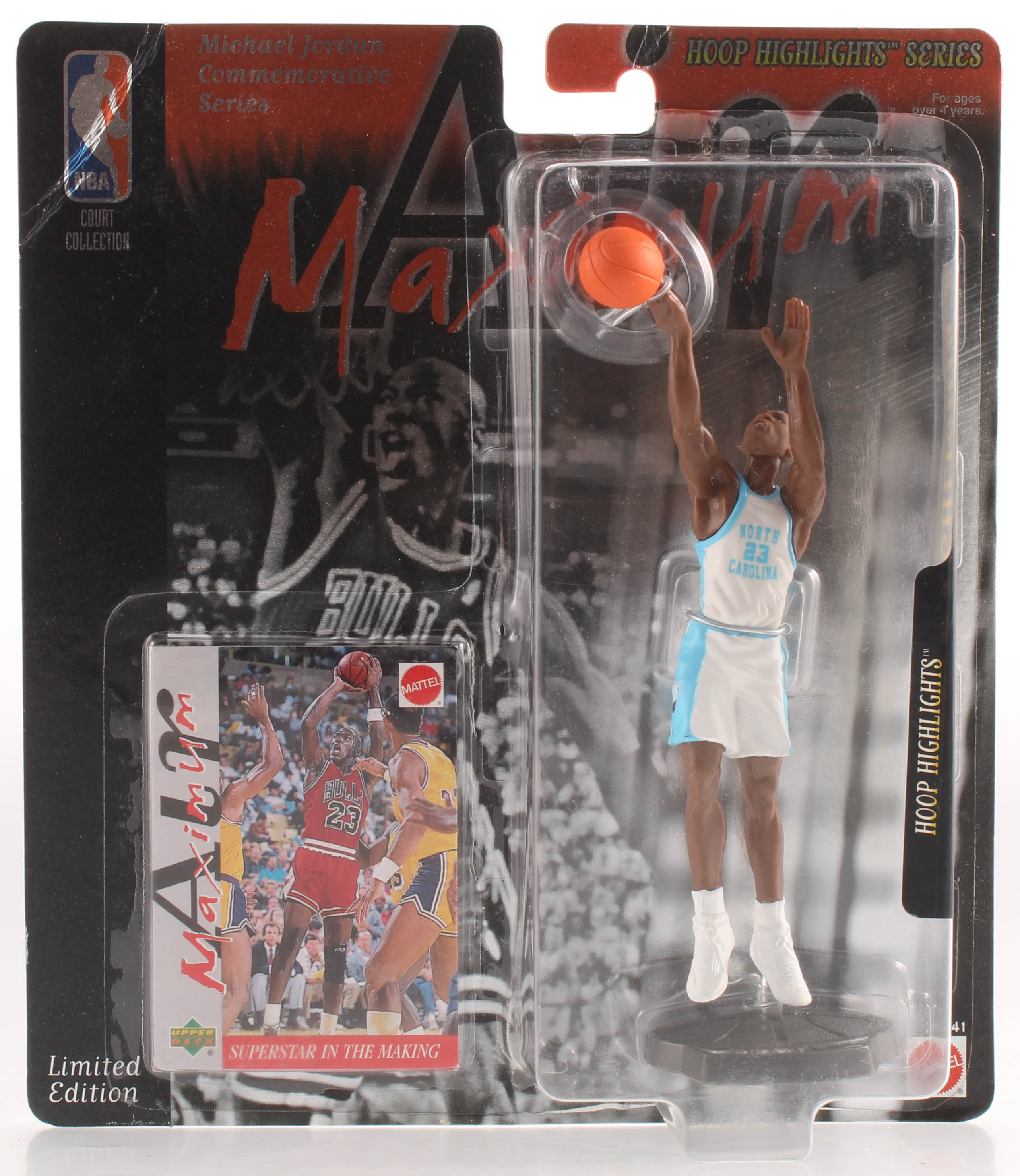 Michael Jordan Air Maximum Hoop Highlight action figure measures approximately 6" in height. Includes original packaging and sealed basketball card as shown.