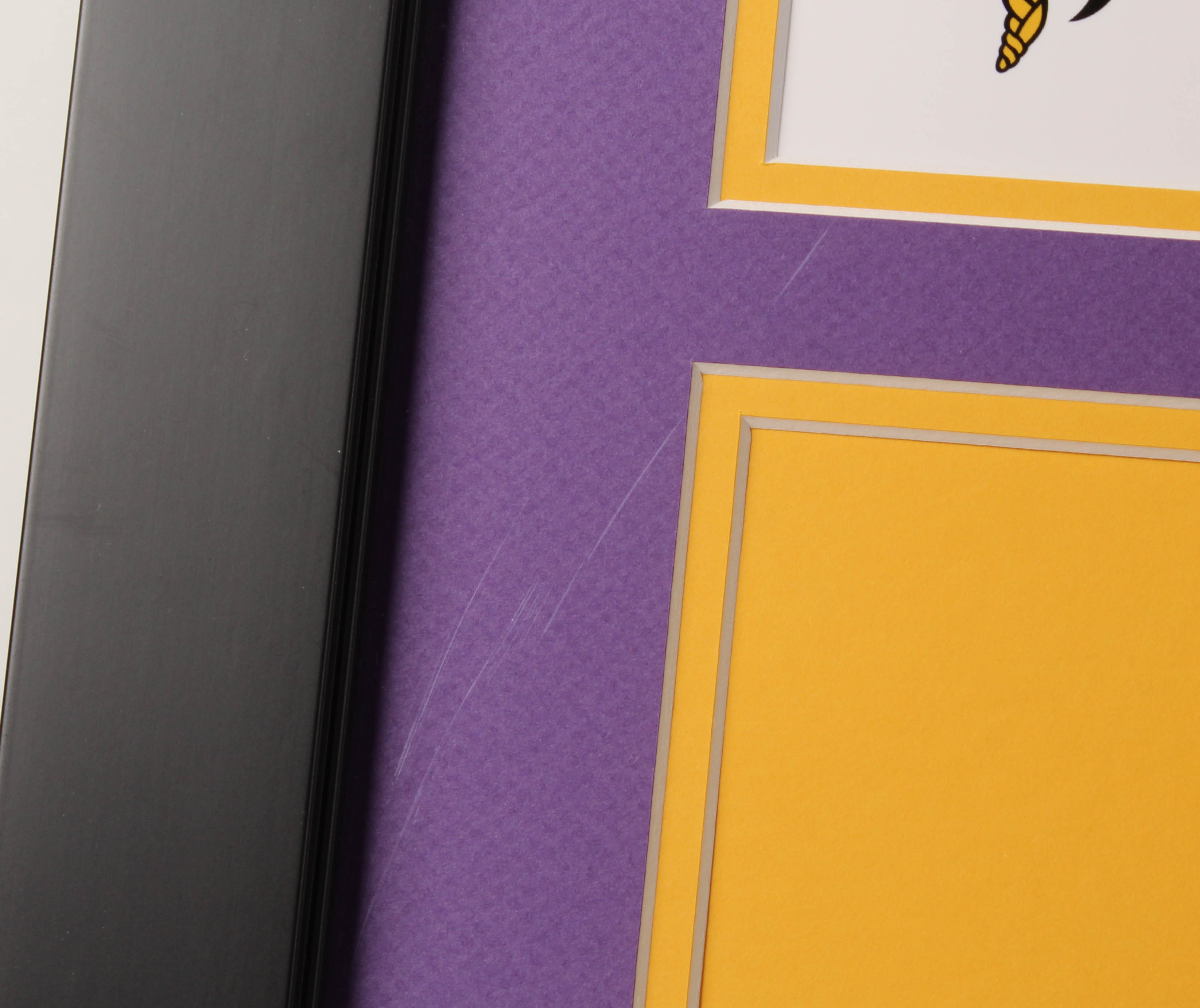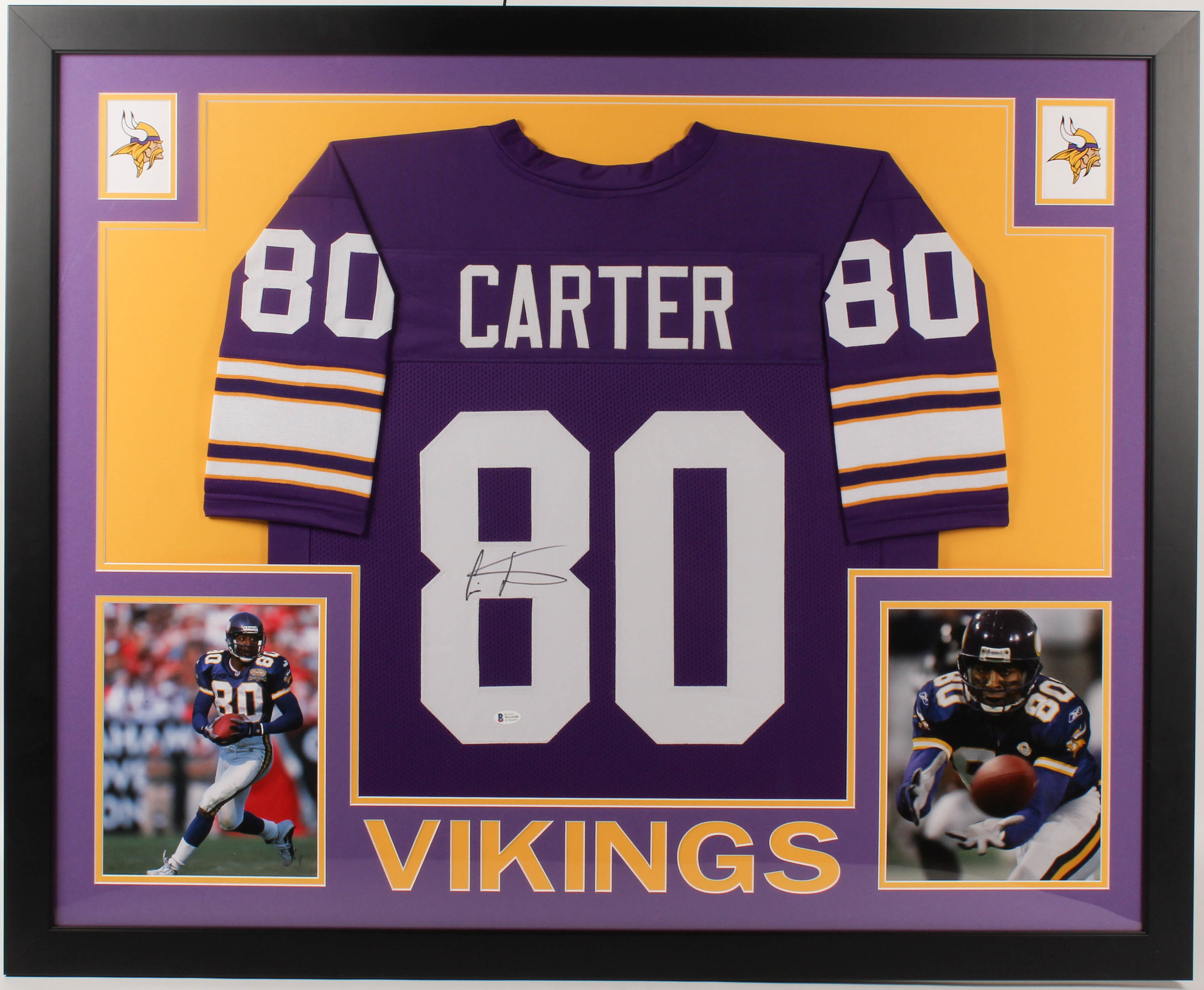 Custom frame measures approximately 35" x 43" in size and features a jersey which has been hand-signed in black felt-tip pen by Cris Carter (HOF). Please see photos for condition of the frame.