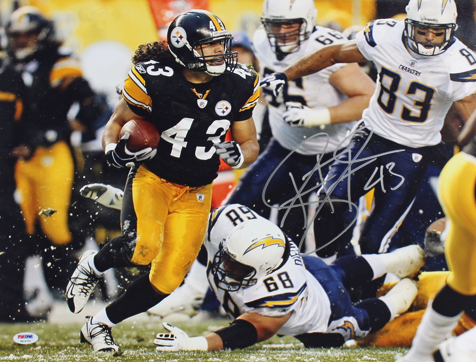 Photo measures 16" x 20" in size and has been hand-signed by Troy Polamalu (Pittsburgh Steelers, HOF).