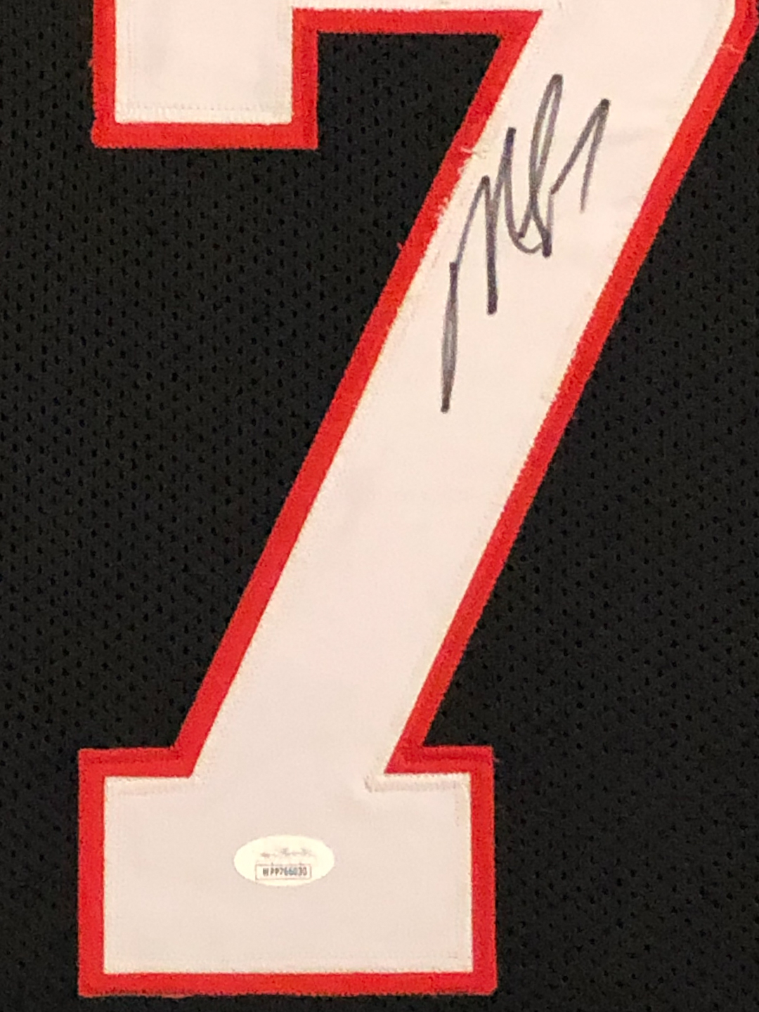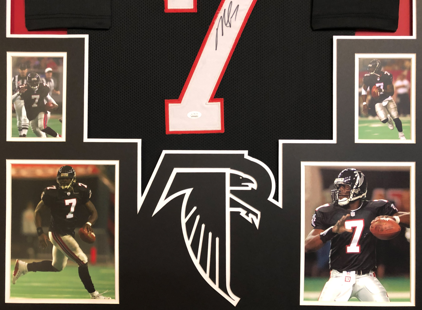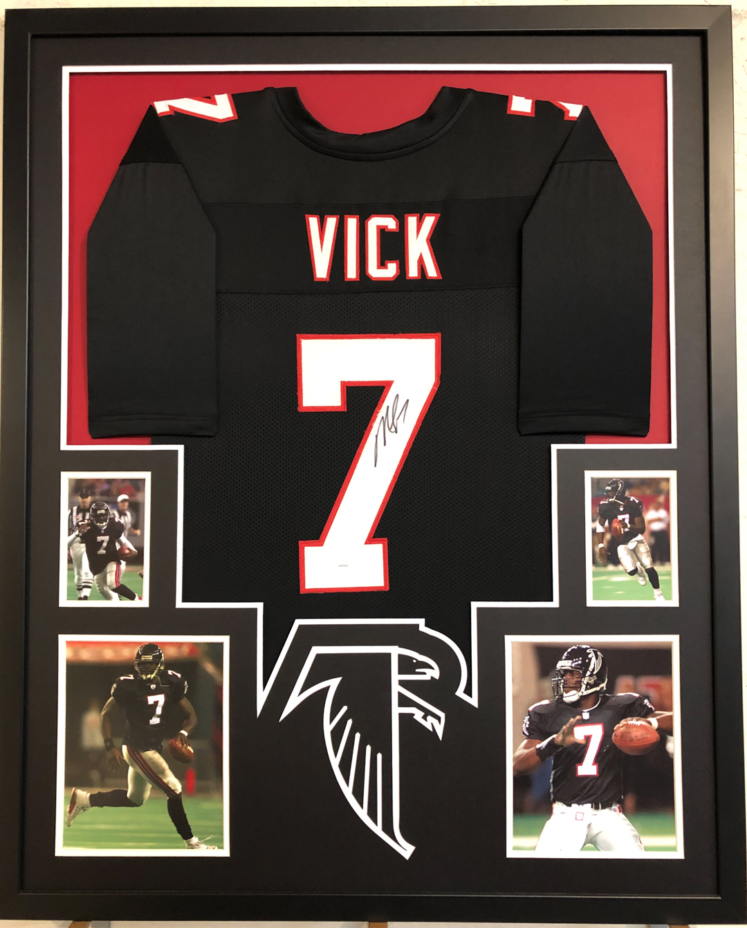 Custom frame measures 34" x 42" in size. Features a jersey that has been hand-signed in black felt-tip pen by Michael Vick.