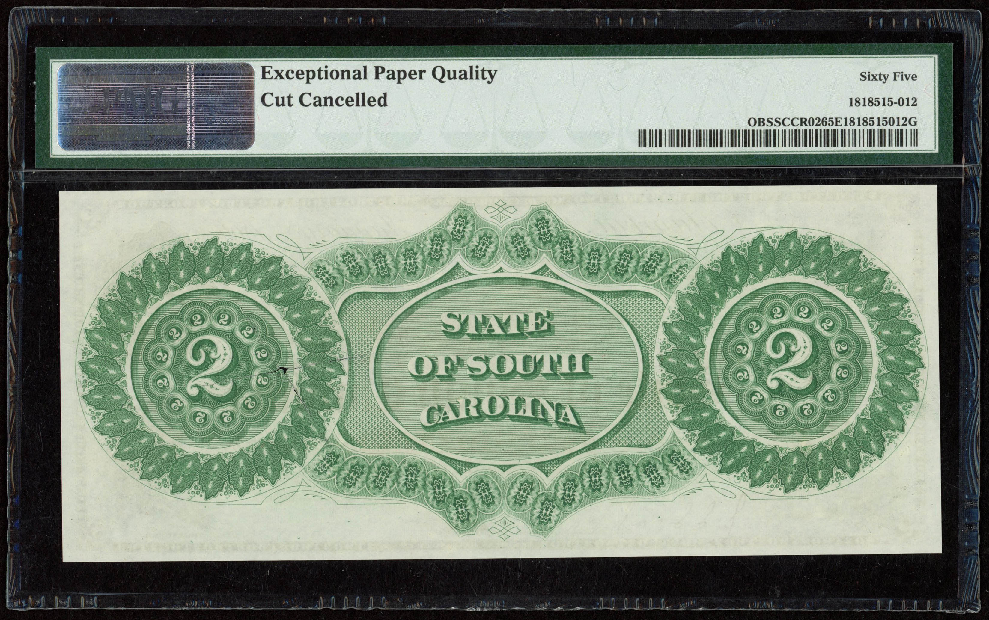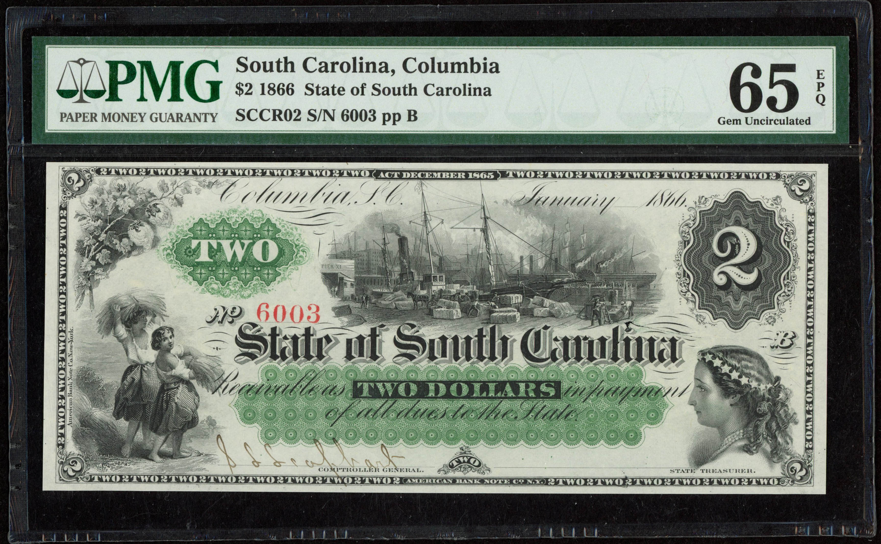 1866 $2 Two-Dollars - South Carolina - Columbia - Bank Note Bill (PMG 65) (EPQ)