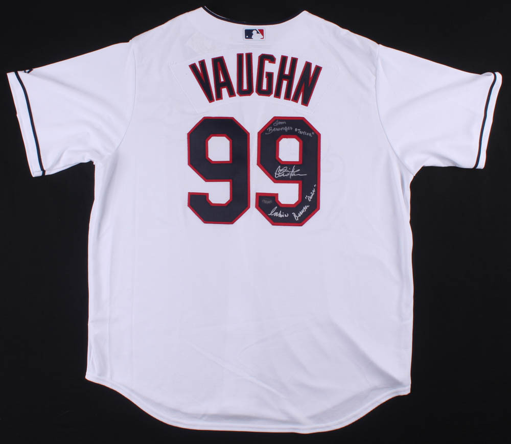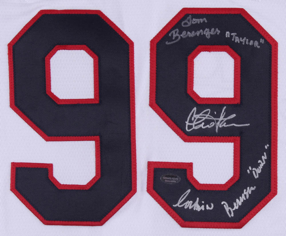 Majestic on-field style jersey. Everything is sewn on, size XL. Hand-signed in silver paint pen by Charlie Sheen (Ricky Vaughn), Tom Berenger (Jake Taylor) and Corbin Bernsen (Roger Dorn).