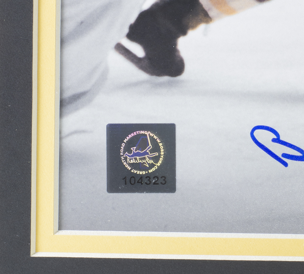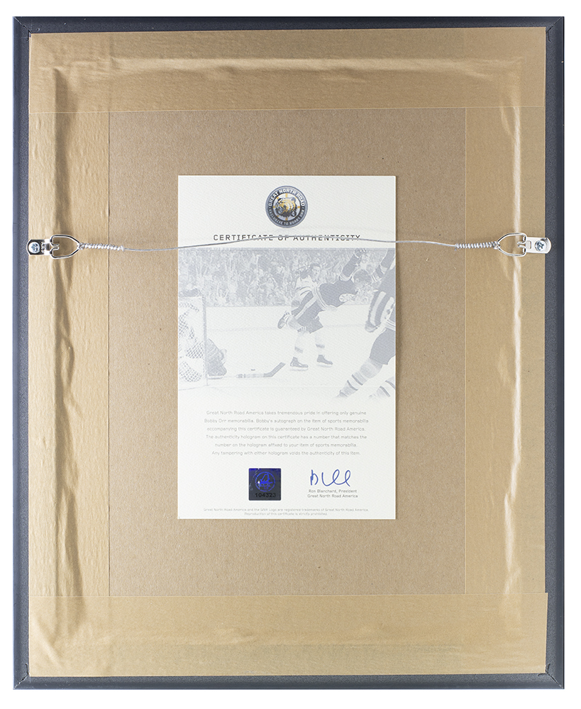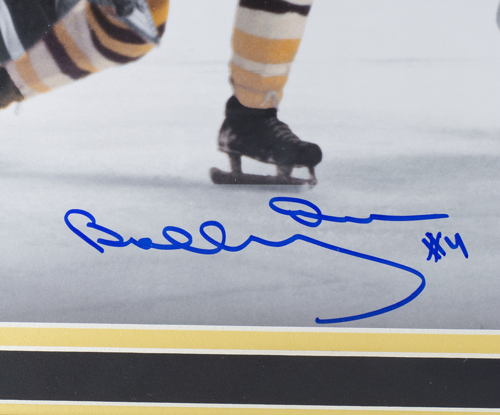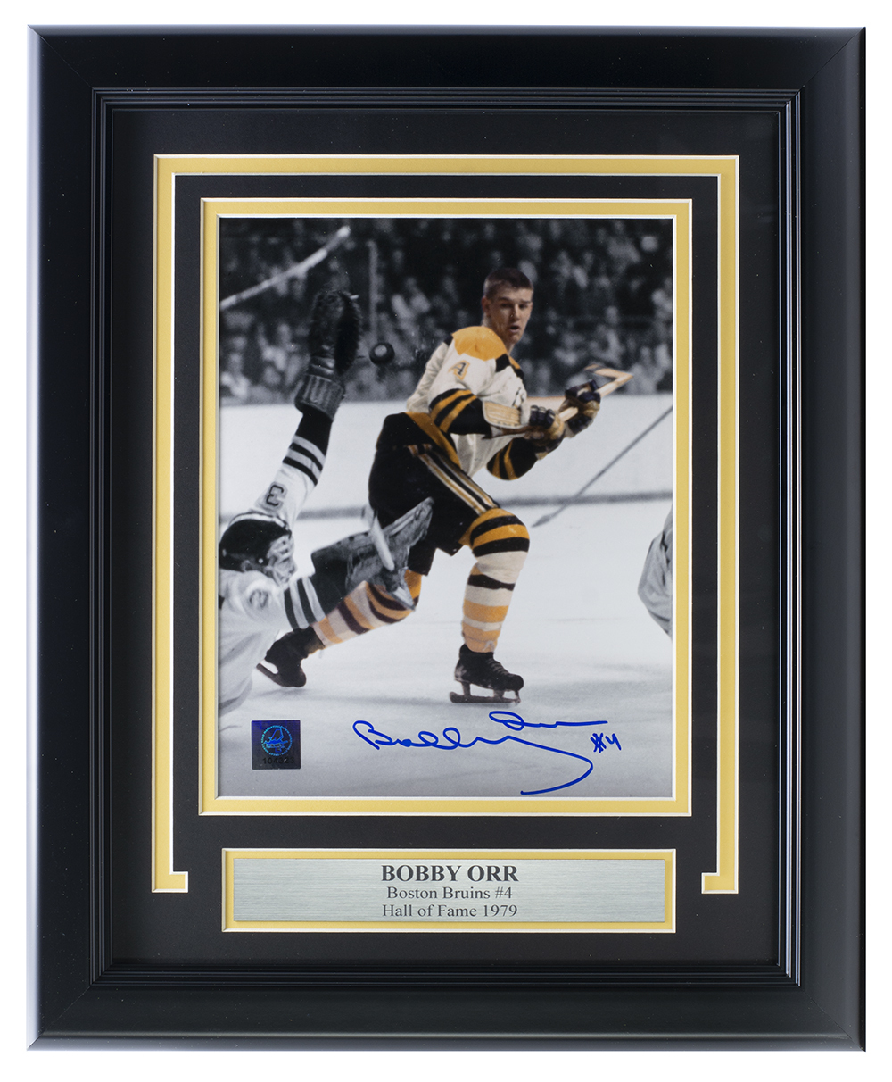 Custom framed display measures 11" x 14" in size and has been hand-signed in blue felt-tip pen by Bobby Orr (Boston Bruins, HOF).
