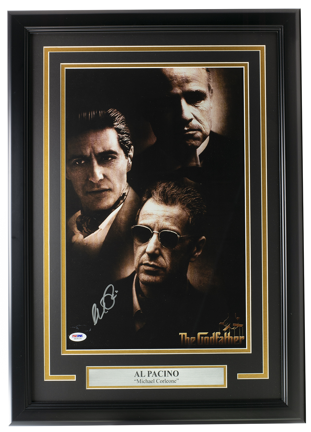 Custom framed display measures approximately 16" x 20" in size and has been hand-signed in silver paint pen by Al Pacino (Michael Corleone).