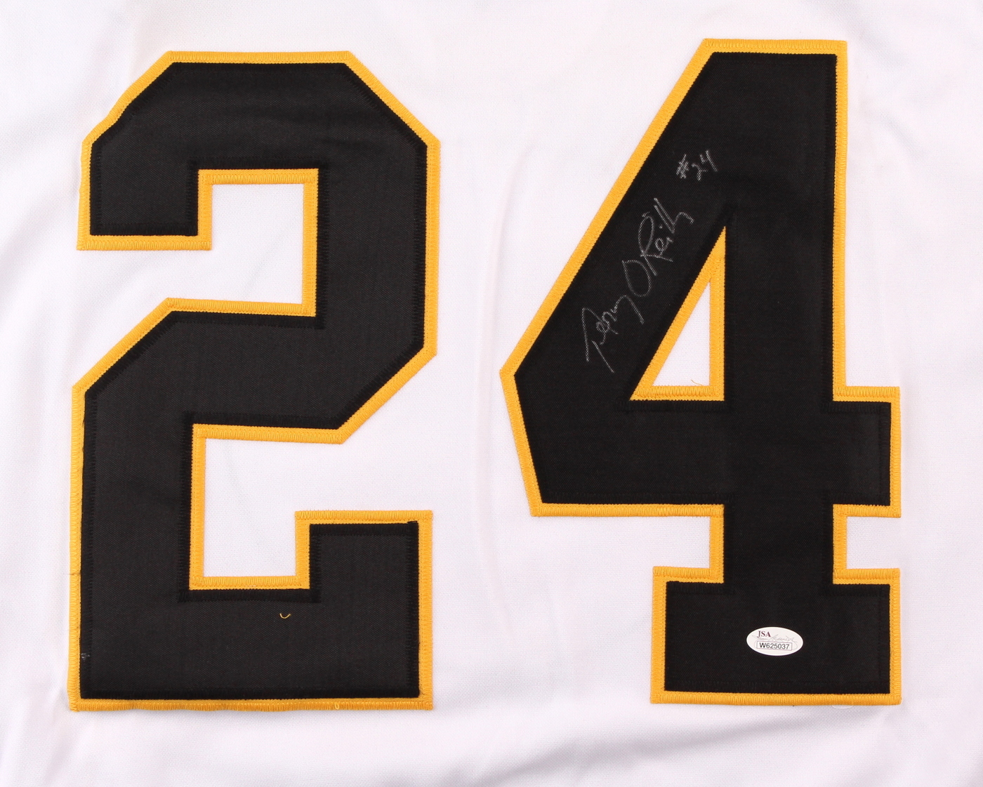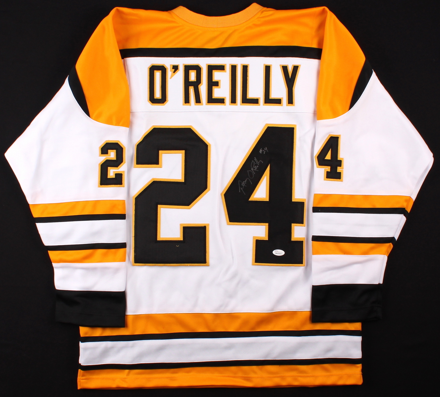 Custom on-ice style jersey. Everything is sewn on, size L. Hand-signed in silver paint pen by Terry O'Reilly. The autograph includes an official James Spence Authentication (JSA) hologram and matching COA for authenticity purposes. The signing of this item was witnessed by JSA.