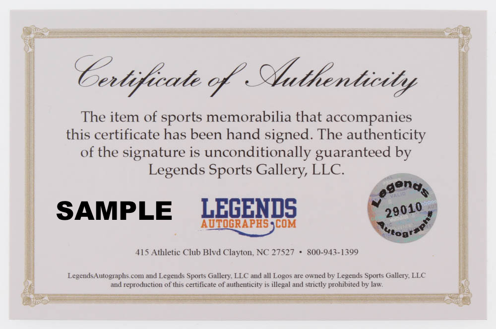 The lot / autograph(s) includes a Legends Autograph hologram and matching COA, as well as an official Beckett Authentication Services serially-numbered hologram for authenticity purposes.