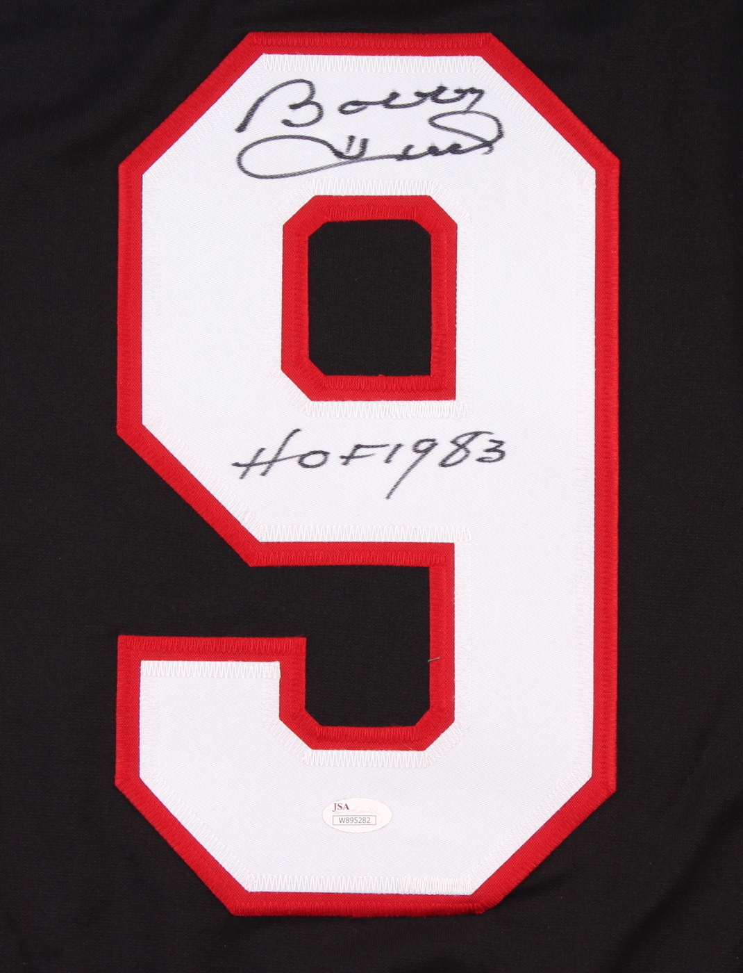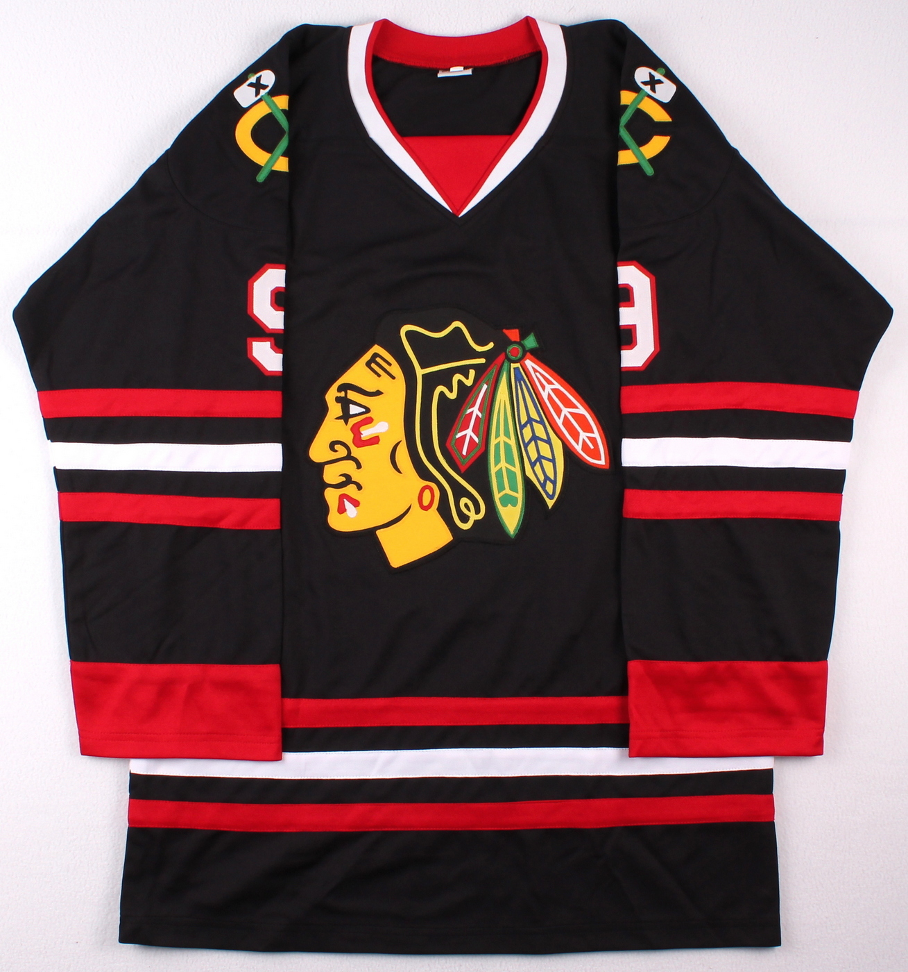 Custom on-ice style jersey. Everything sewn on, size XL. Hand-signed and inscribed in black felt tip pen by Bobby Hull (Blackhawks, HOF). The autograph includes an official James Spence Authentication (JSA) hologram and matching COA for authenticity purposes. The signing of this item was witnessed by JSA.