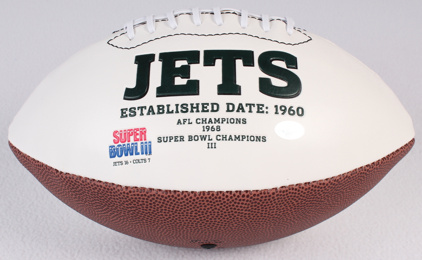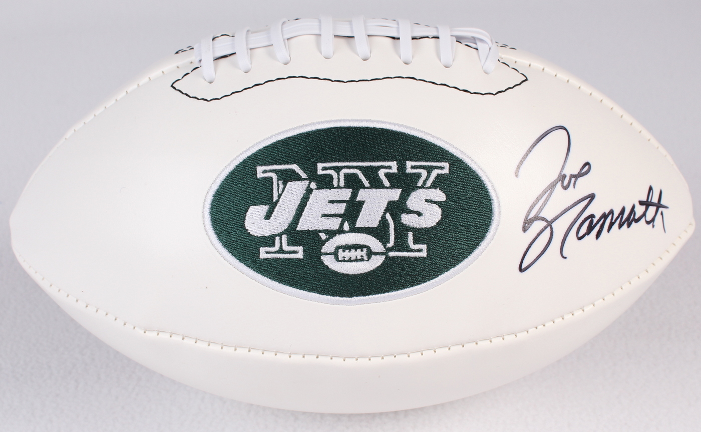 Jets Logo Football. Hand-signed in black felt-tip pen by Joe Namath (Jets HOF). The autograph includes an official Joe Namath hologram for authenticity purposes.