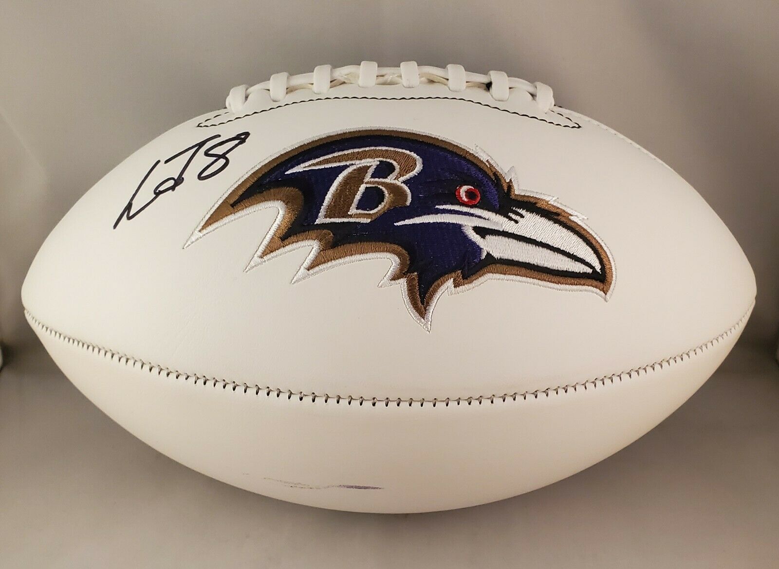 Baltimore Ravens Logo Football has been hand-signed in black felt-tip pen by Lamar Jackson.