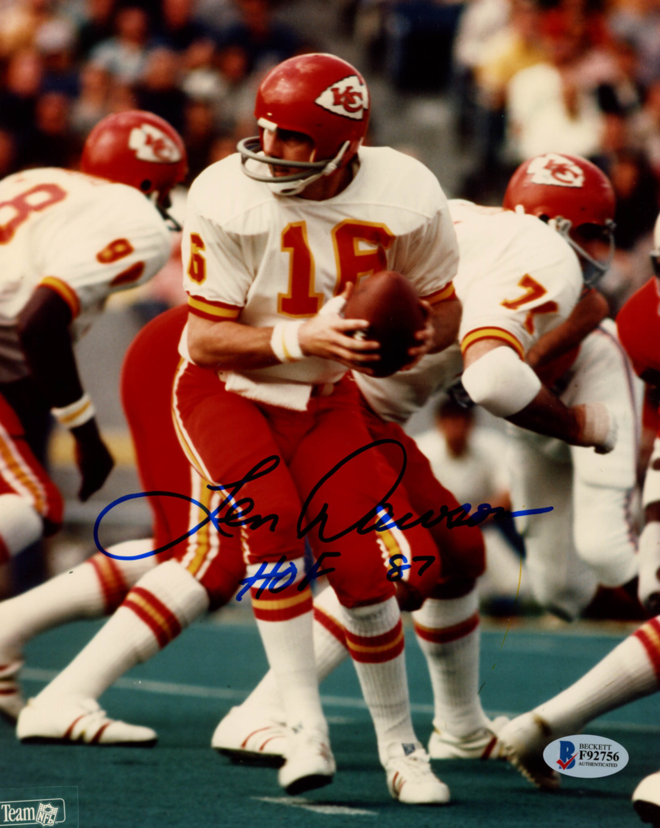 Len Dawson Signed Cheifs 8x10 Photo Inscribed "HOF 87" (Beckett COA)