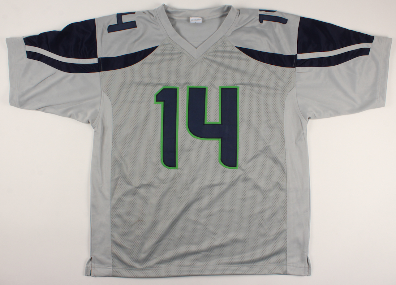 Custom on-field style jersey. Everything sewn on, size XL. Hand-signed in silver paint pen by D.K. Metcalf.