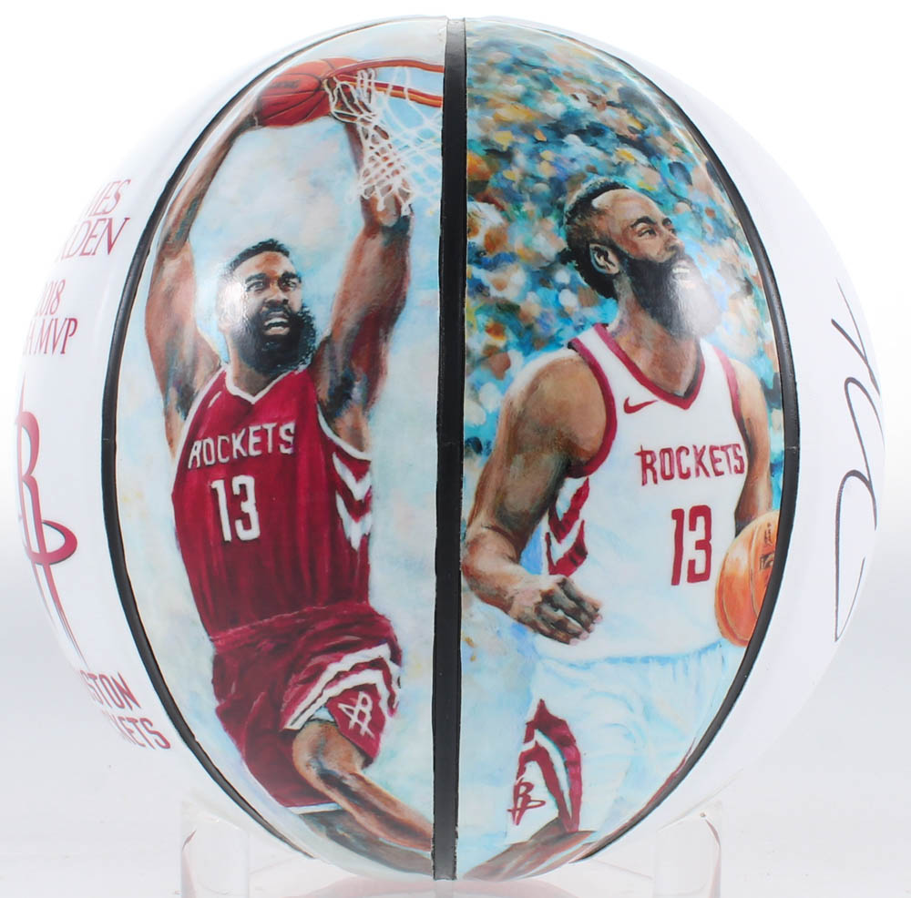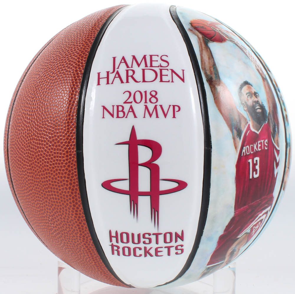 2018 NBA MVP logo basketball hand-signed in black felt-tip pen by James Harden (Houston Rockets).