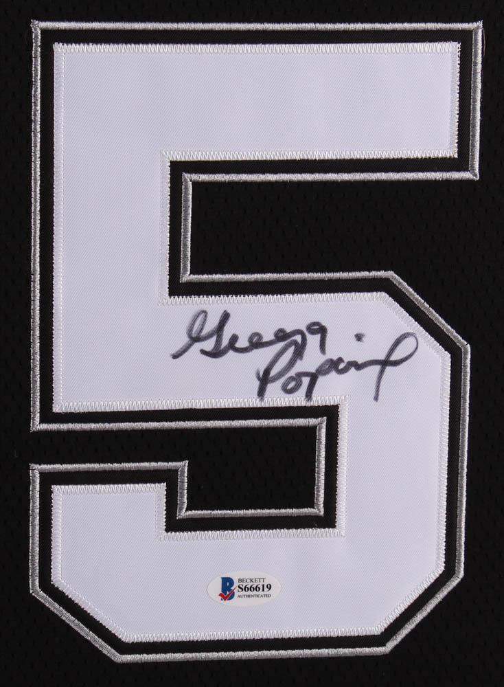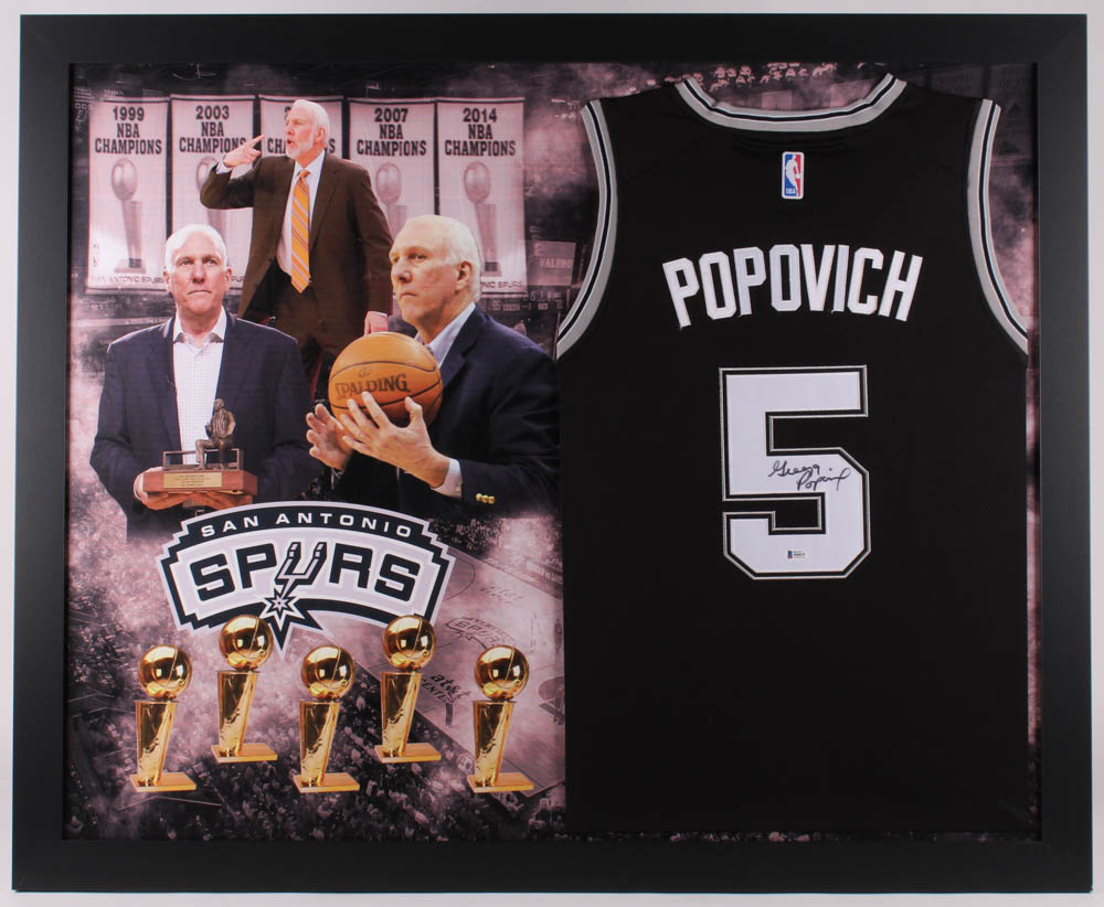 Custom frame measures 35" x 43" in size and features a jersey that has been hand-signed in black felt-tip pen by Gregg Popovich.