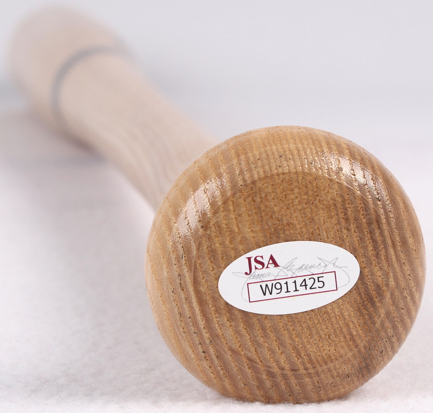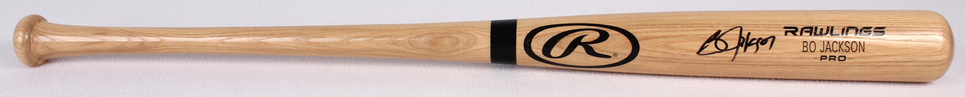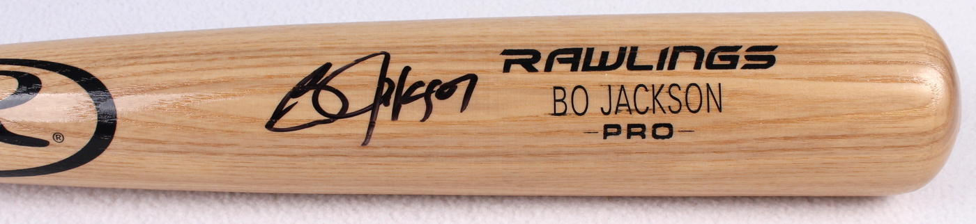 Full-size custom engraved Rawlings pro bat. Hand-signed in black felt-tip by Bo Jackson (Raiders, Royals, White Sox). The autograph includes an official James Spence Authentication (JSA) hologram and matching COA for authenticity purposes. The signing of this item was witnessed by JSA.
