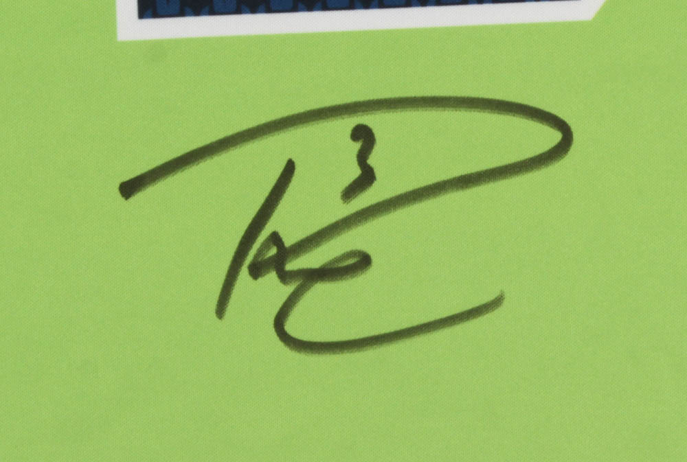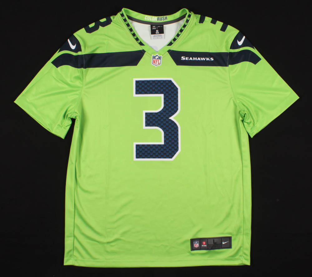 Nike on-field style jersey. Everything is printed on, size L. Hand-signed in black felt-tip pen by Russell Wilson (Seattle Seahawks).