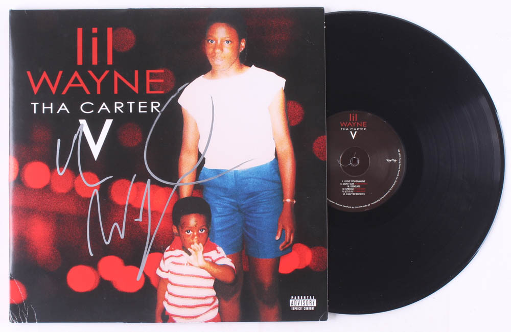 "Tha Carter V" vinyl record album cover has been hand-signed in silver paint pen by Lil Wayne.