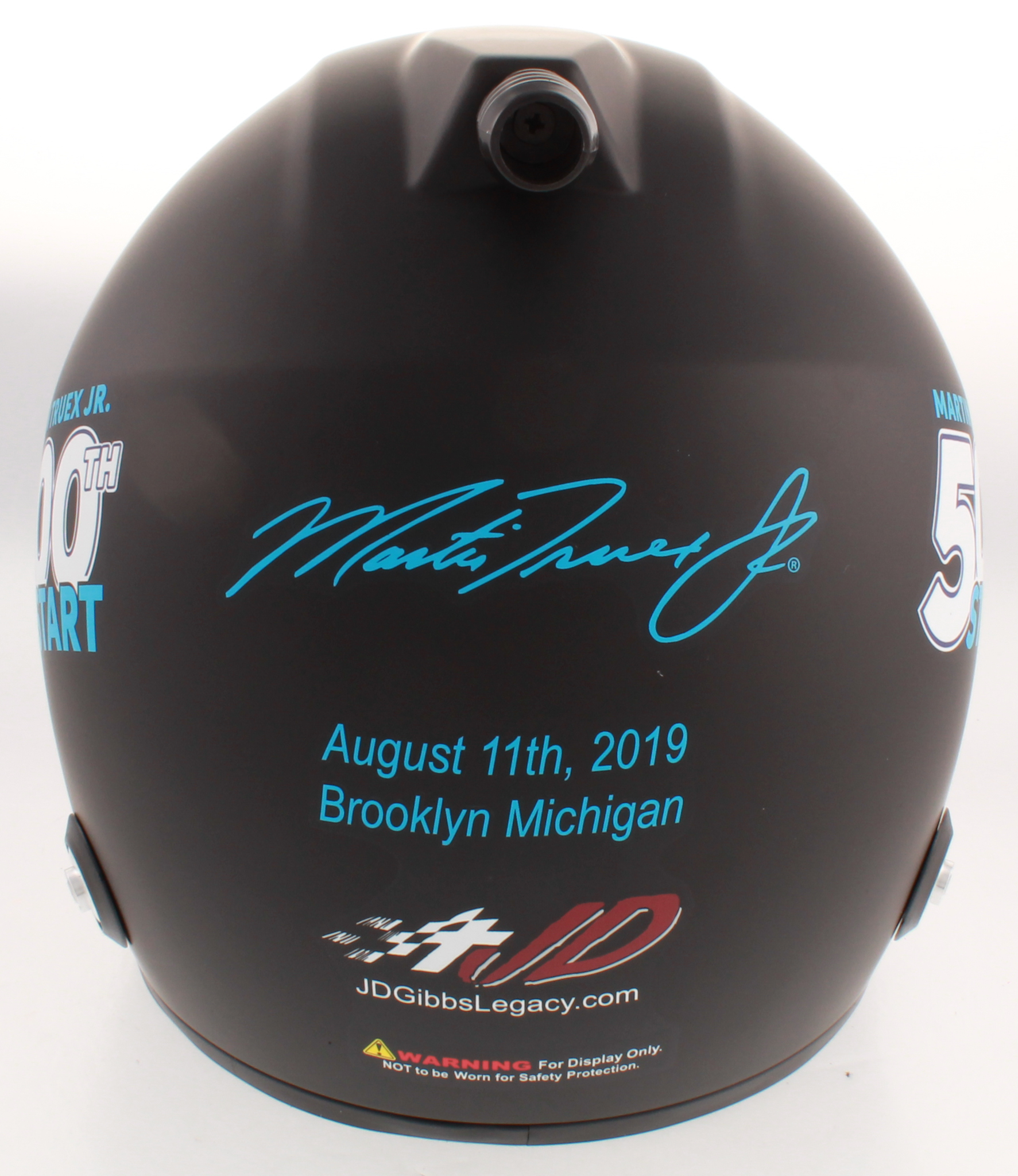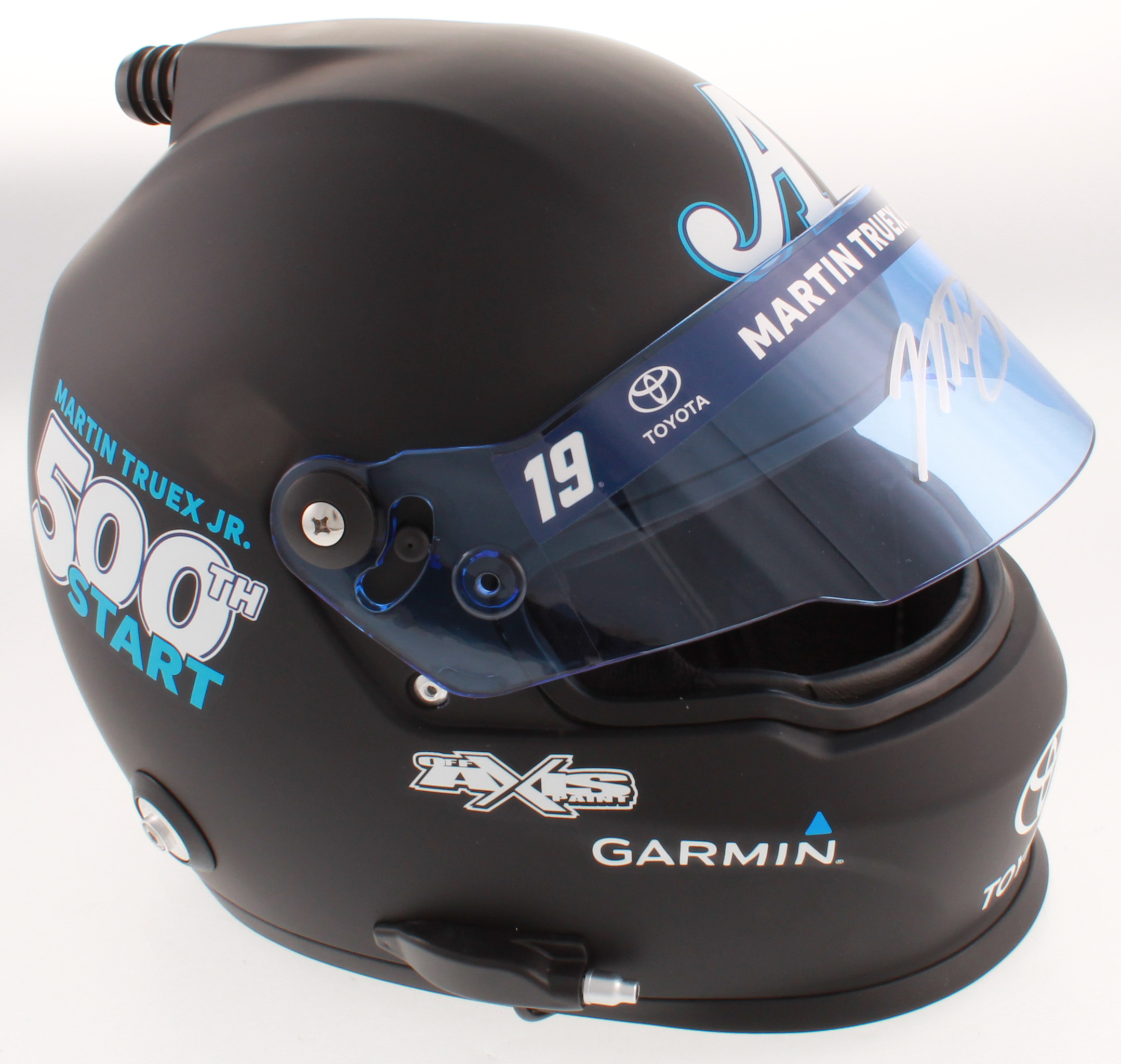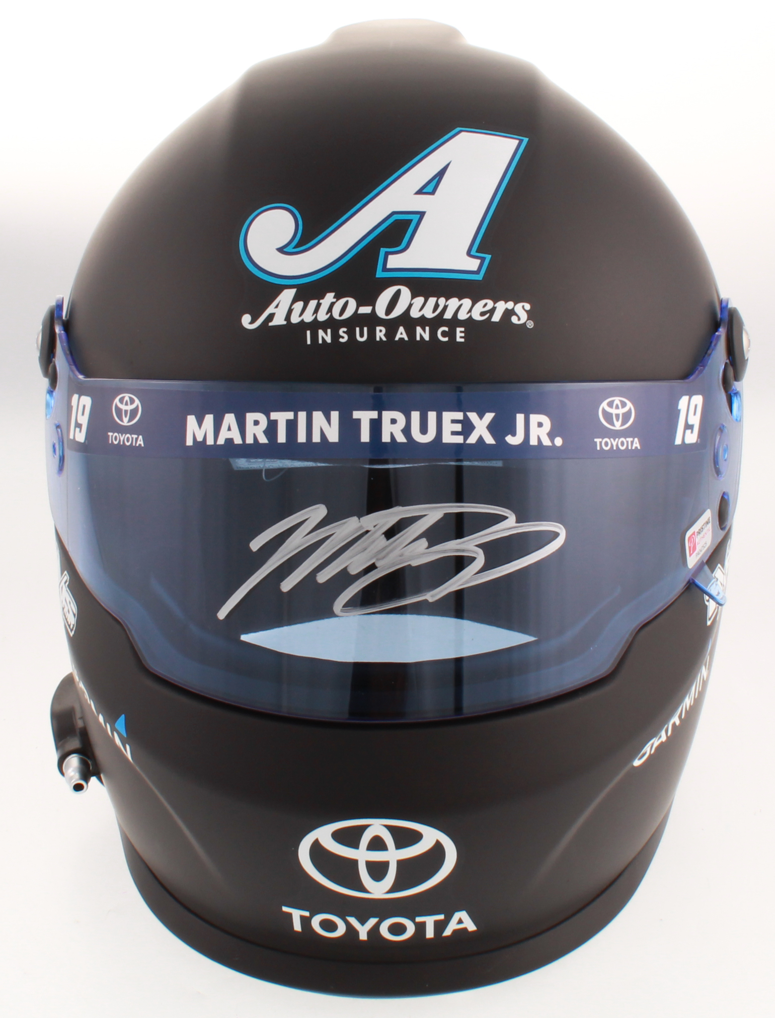 Full-size replica NASCAR helmet is hand-signed on the visor by Martin Truex Jr.