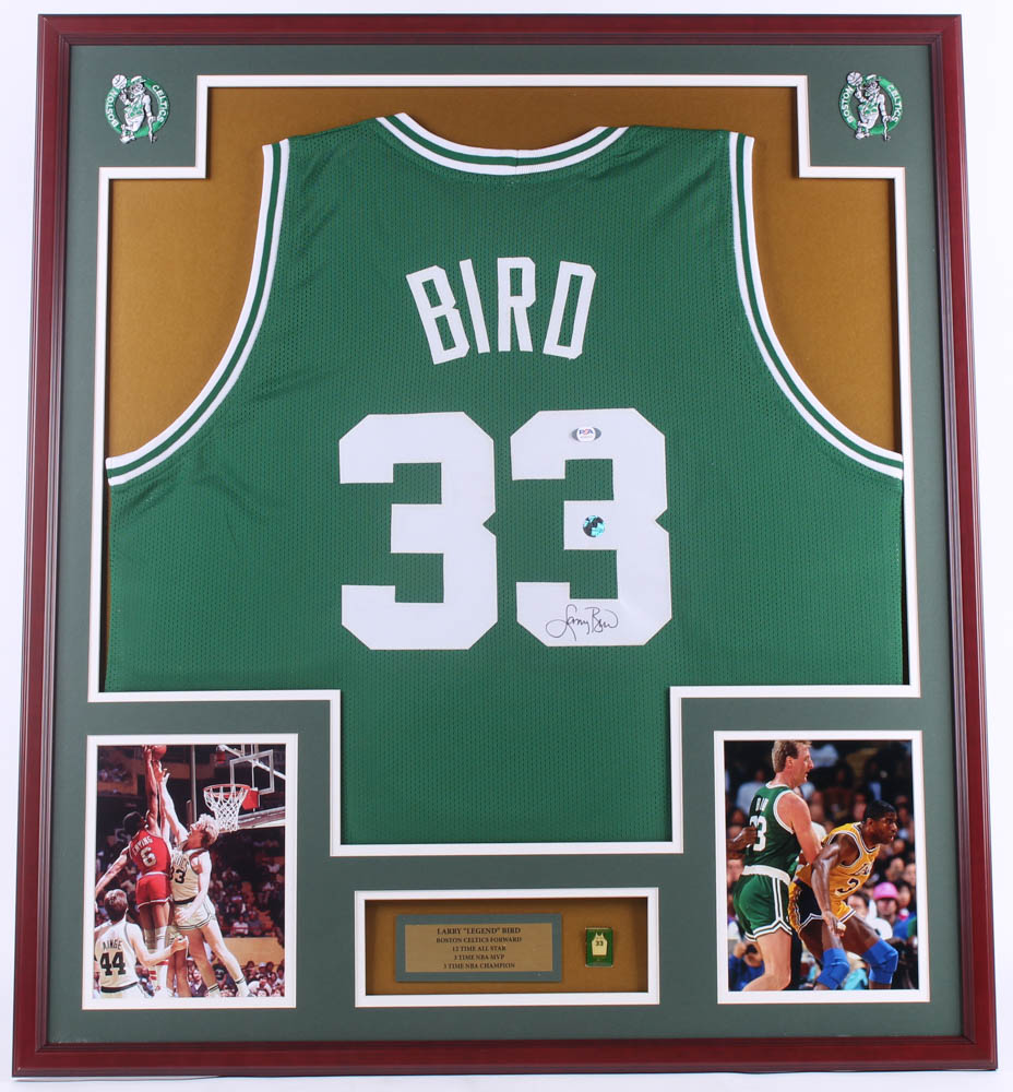 Custom frame measures 32" x 36" in size and features a jersey that has been hand-signed in black felt-tip pen by Larry Bird (Boston Celtics, HOF). Display also features a Boston Celtics pin.