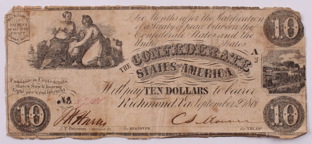 1861 $10 Ten-Dollar Confederate States of America Richmond CSA Bank Note