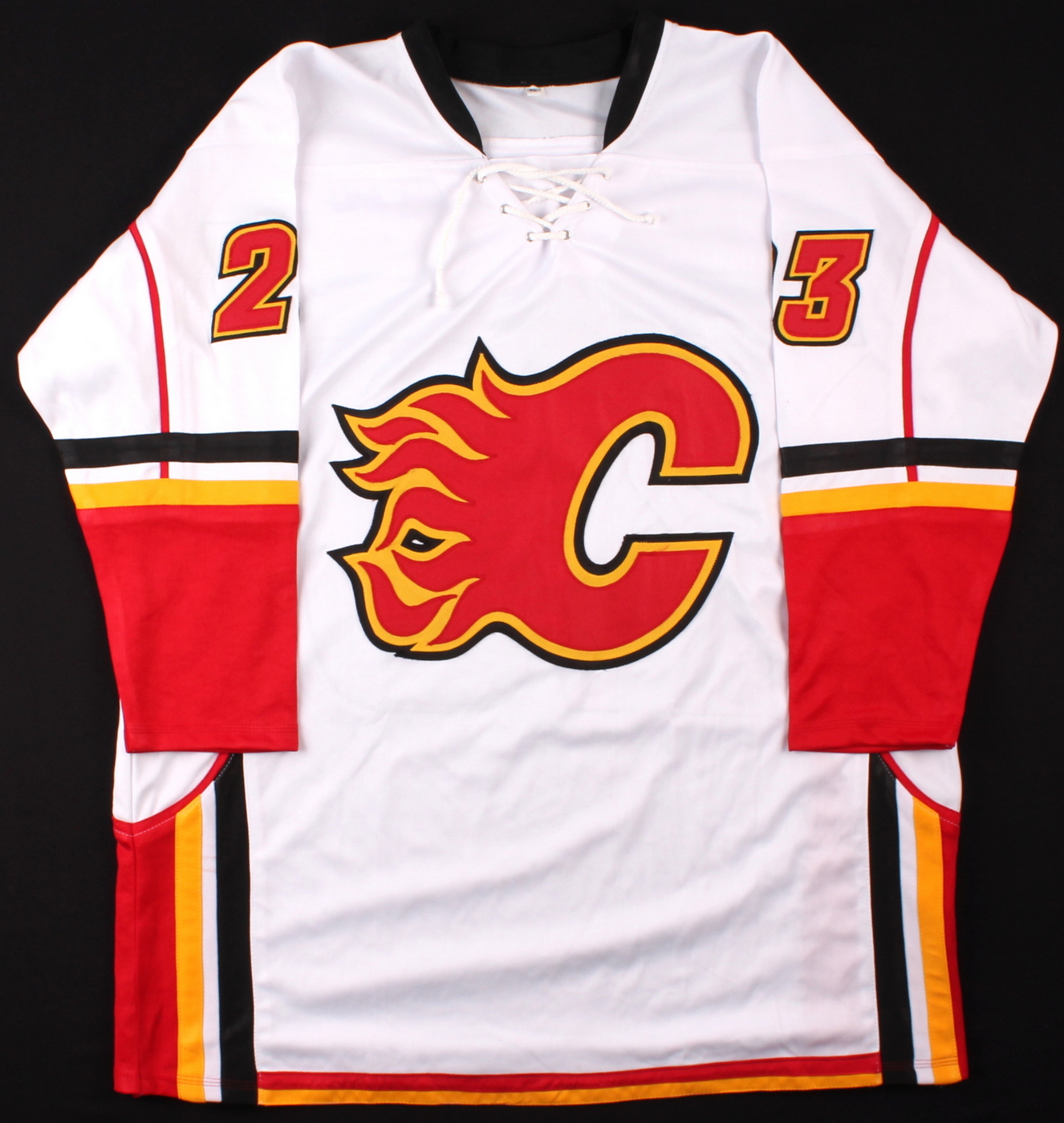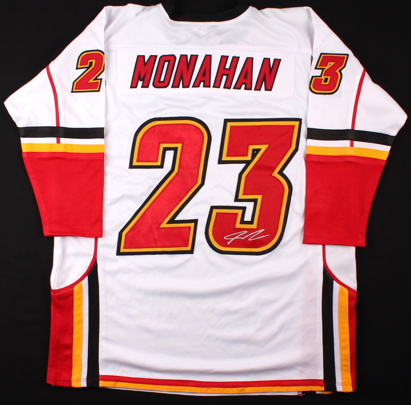 Custom on-ice style jersey. Everything sewn on, size XL. Hand-signed in silver paint pen by Sean Monahan. The autograph includes an LOA and lifetime authenticity guarantee from Pristine Auction.