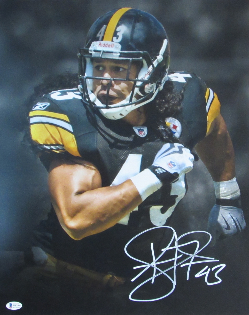 Photo measures 16" x 20" in size and has been hand-signed in white paint pen by Troy Polamalu (Pittsburgh Steelers, HOF).