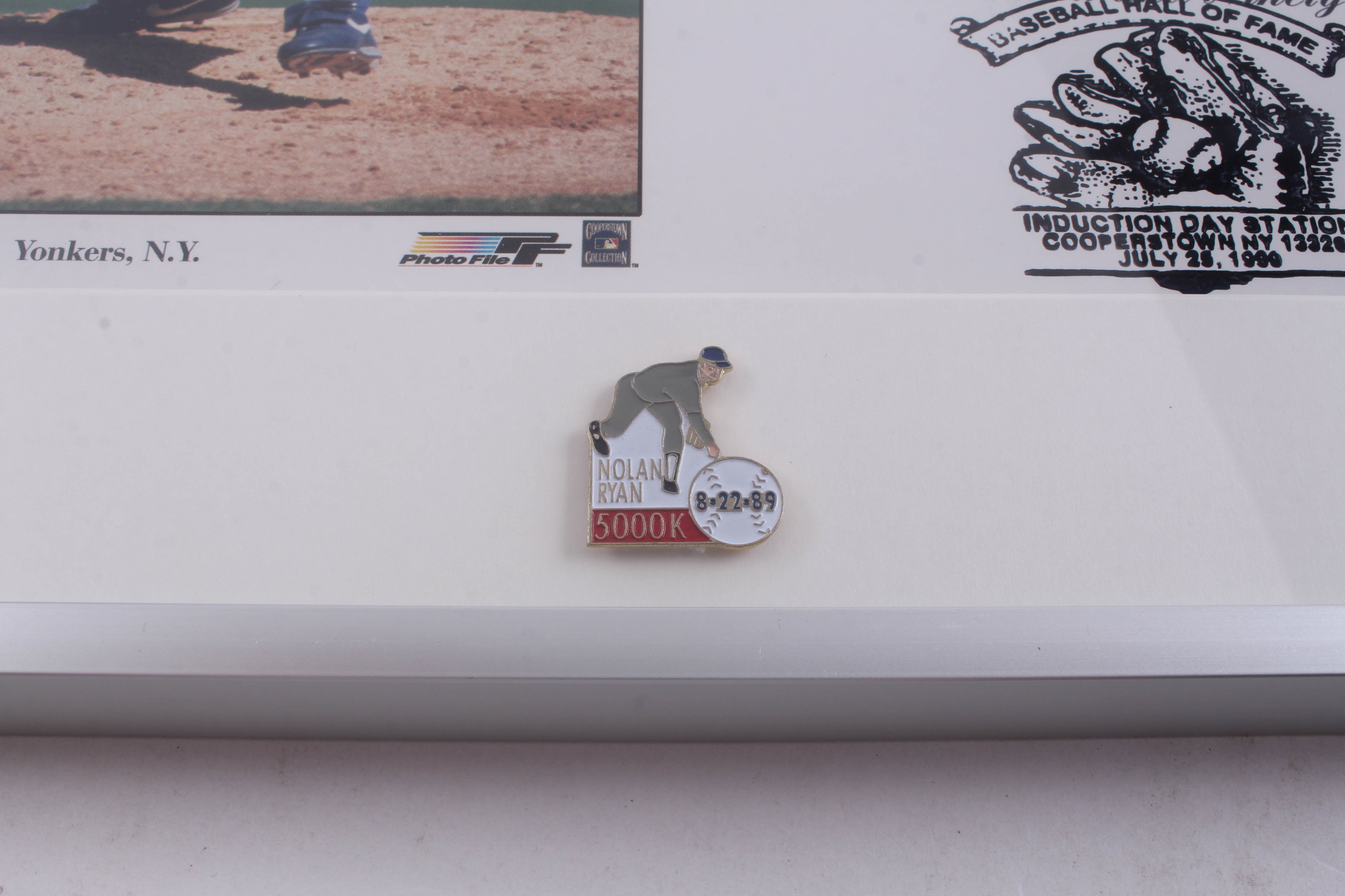Custom framed photo display measures 11.5" x 14.5" in size and has been hand-signed in blue felt-tip pen by Nolan Ryan (HOF). Display also features a Nolan Ryan "5000K" pin.