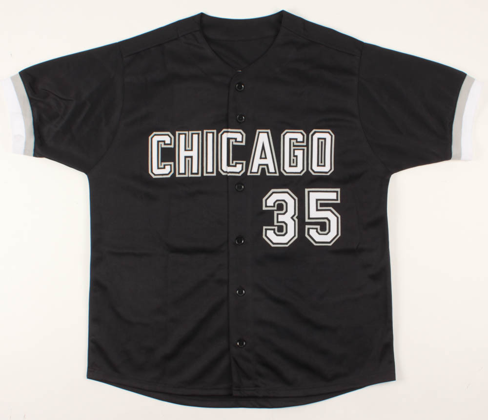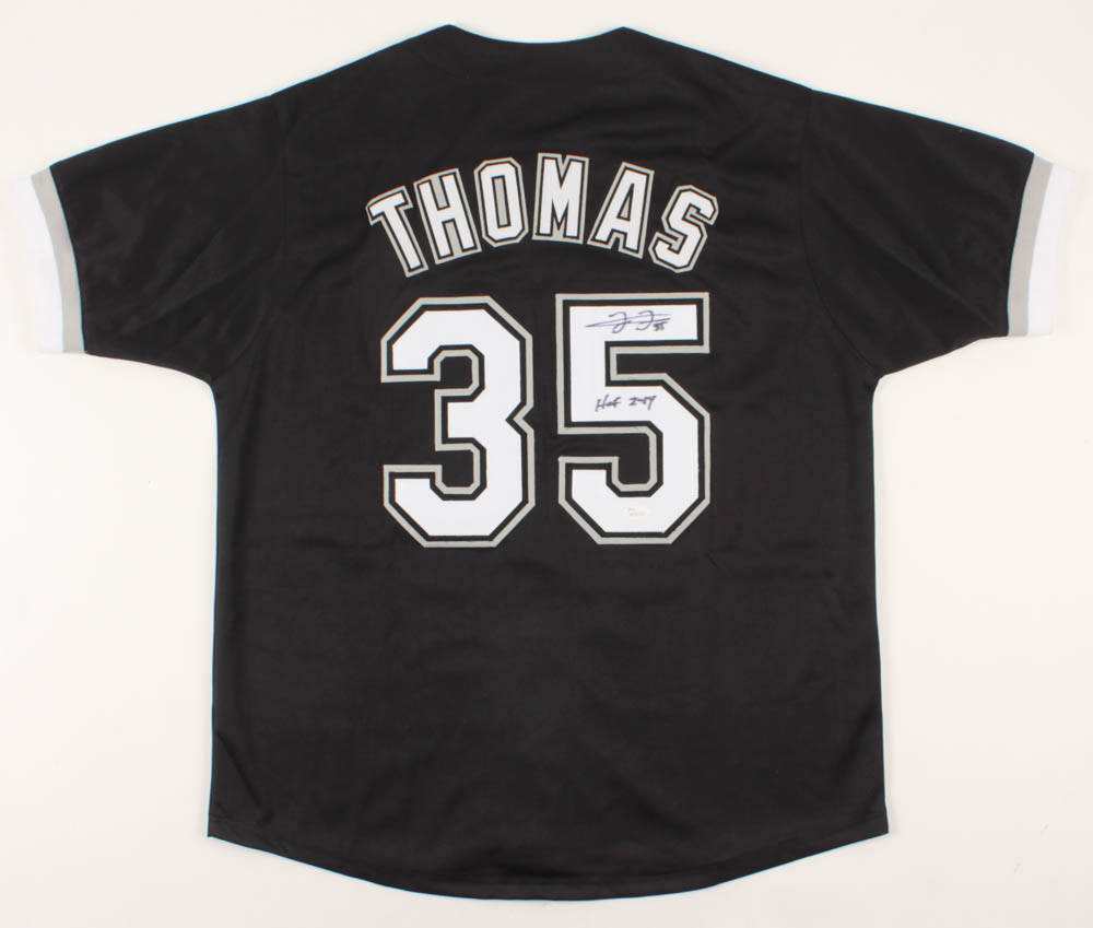 Custom on-field style jersey. Everything is sewn on, size XL. Has been hand-signed and inscribed in black felt-tip pen by Frank Thomas (HOF).