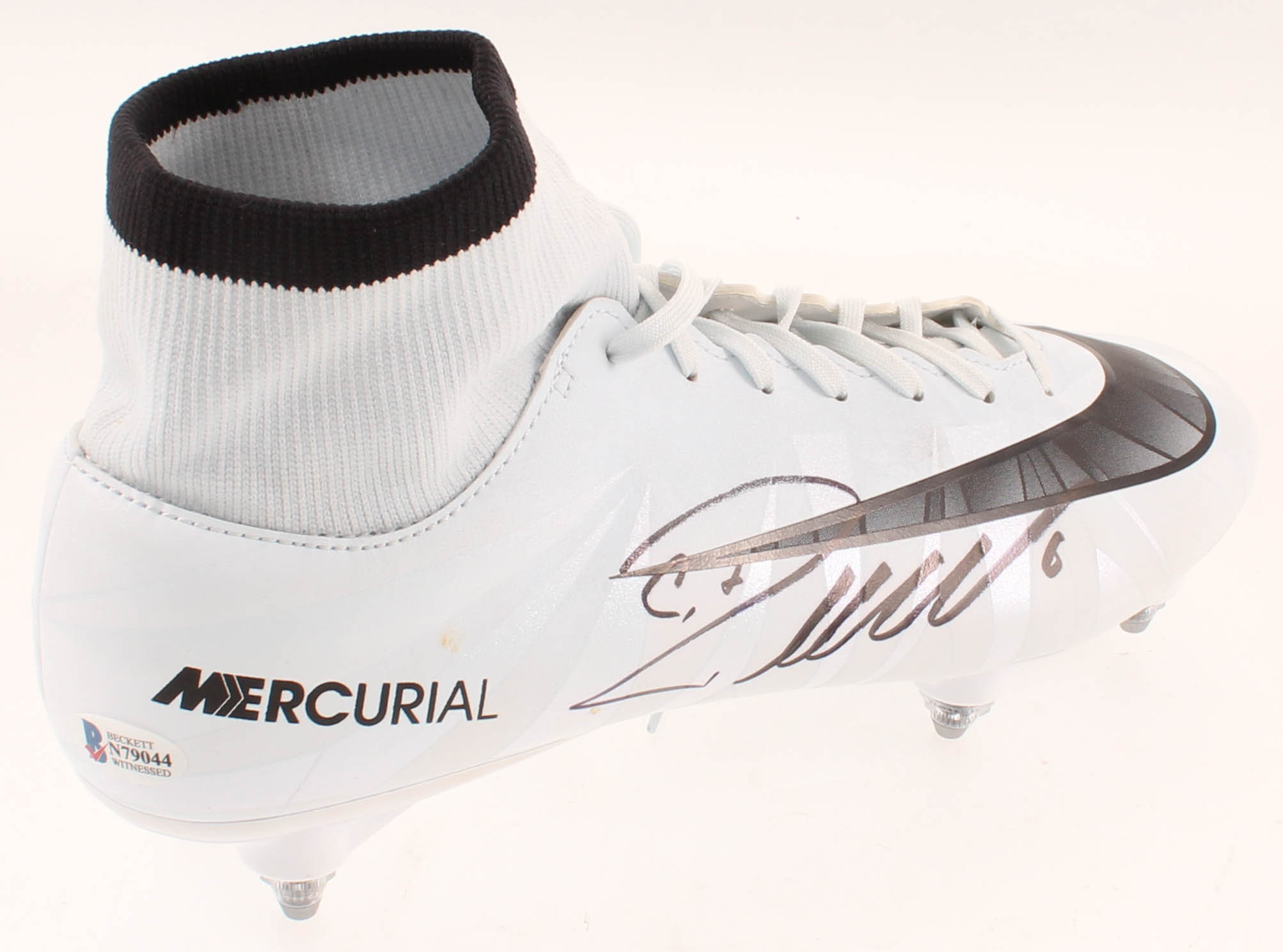 Nike Mercurial soccer cleat, size 9. Hand-signed in black felt-tip pen by Cristiano Ronaldo (Juventus). Please see images for details regarding the condition of the cleat.