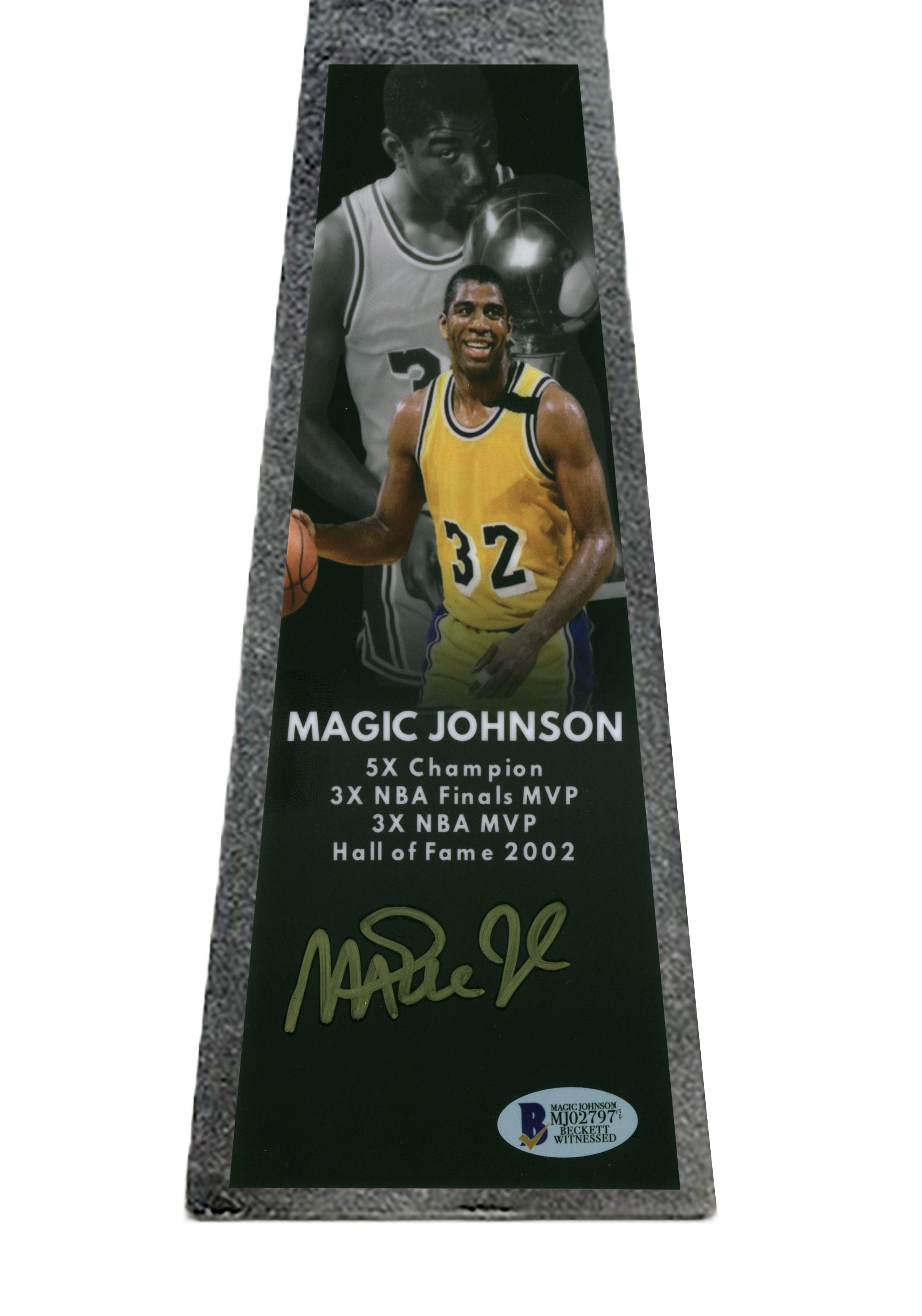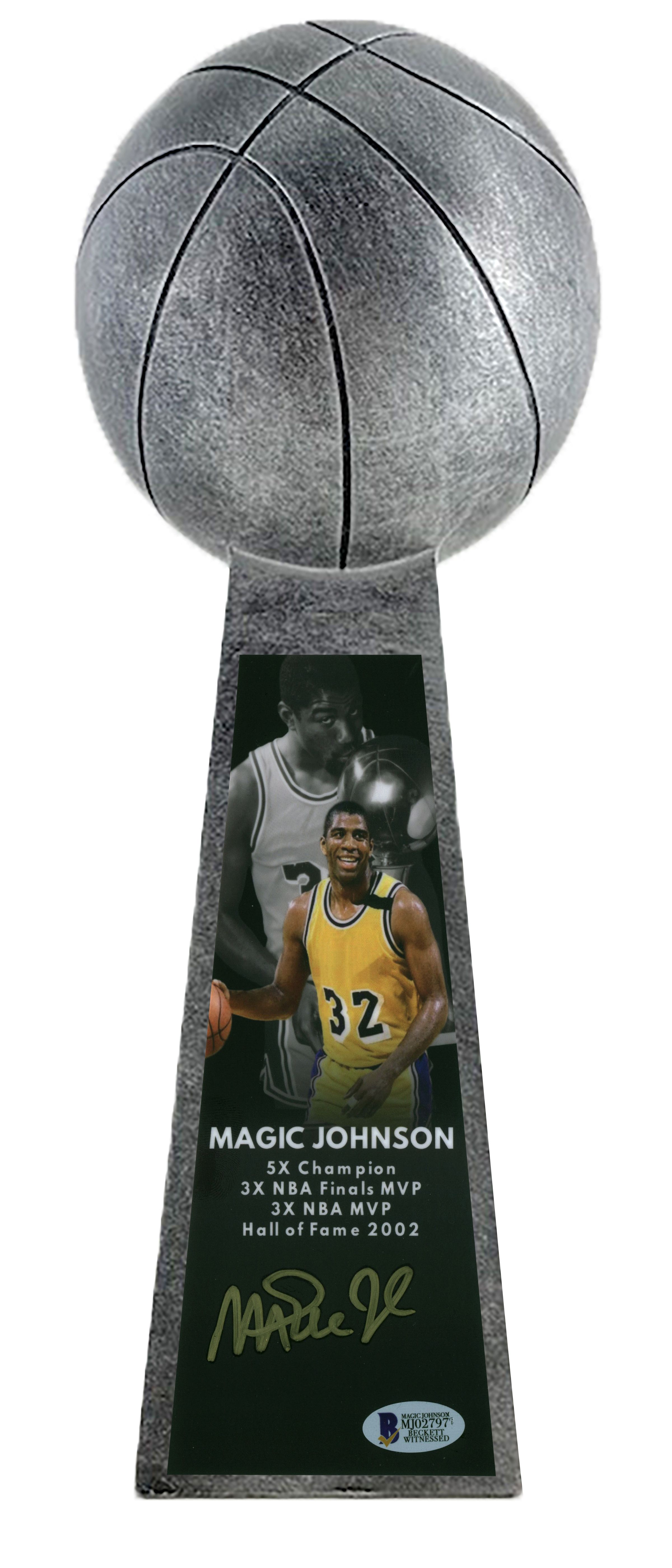 Replica championship basketball trophy measures approximately 14" in height and has been hand-signed in gold paint pen by Magic Johnson (Los Angeles Lakers, HOF).