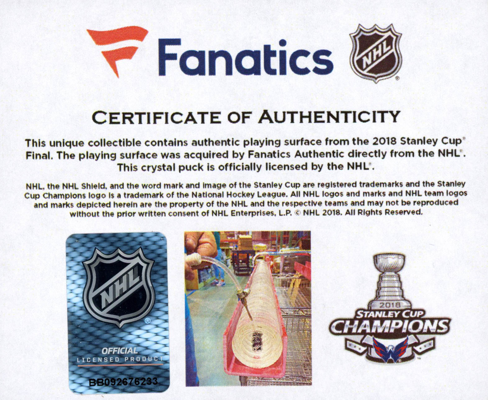 Commemorate the 2018 Stanley Cup with this crystal puck. Each puck comes filled with melted game-used ice from the 2018 Stanley Cup Finals and shipped in a Fanatics Authentic gift box. It is officially licensed by the National Hockey League and comes with a certificate of authenticity.