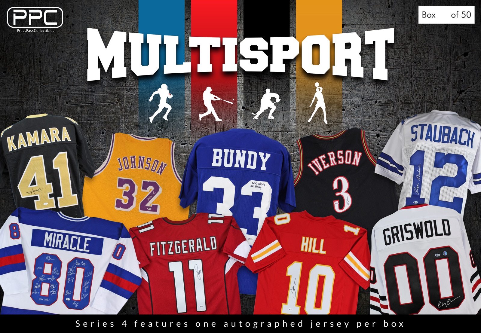 The Press Pass Collectibles 2020 Multi-Sport jersey mystery box includes one (1) custom jersey from one of four major sports (NFL, NBA, MLB, NHL). Mega hit boxes will feature jerseys signed by Allen Iverson, Chevy Chase, Tyreek Hill, Alvin Kamara, and many more!