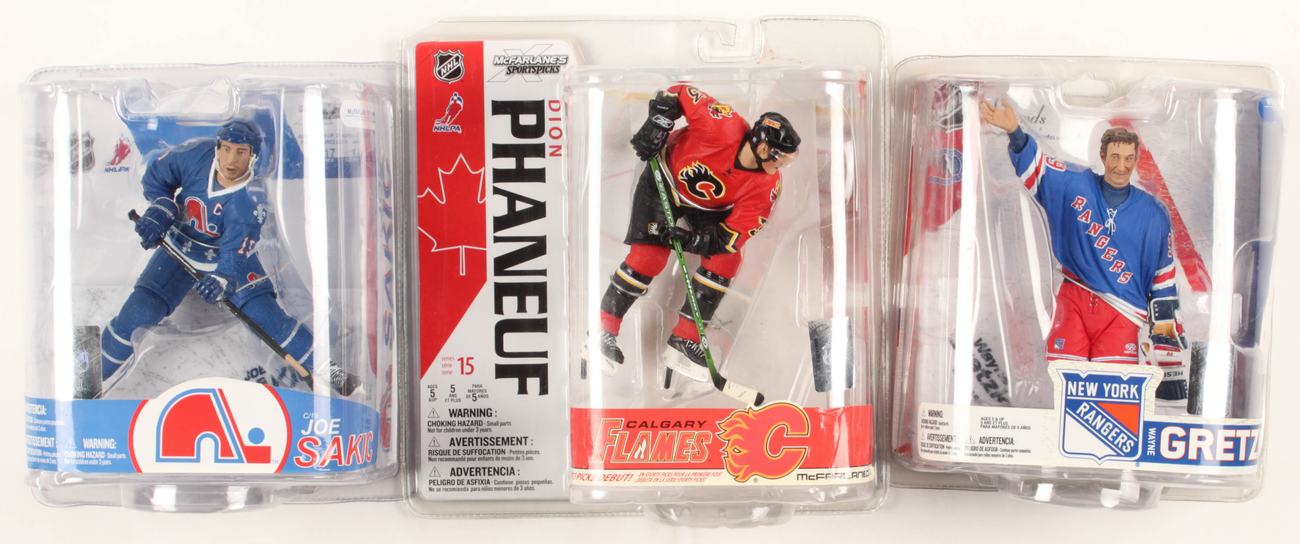 Lot includes all (3) items as shown. Lot includes (1) Joe Sakic Quebec Nordiques Action Figure, (1) Wayne Gretzky New York Rangers Action Figure, and (1) Dion Phaneuf Calgary Flames Action Figure. Please see photos for details.