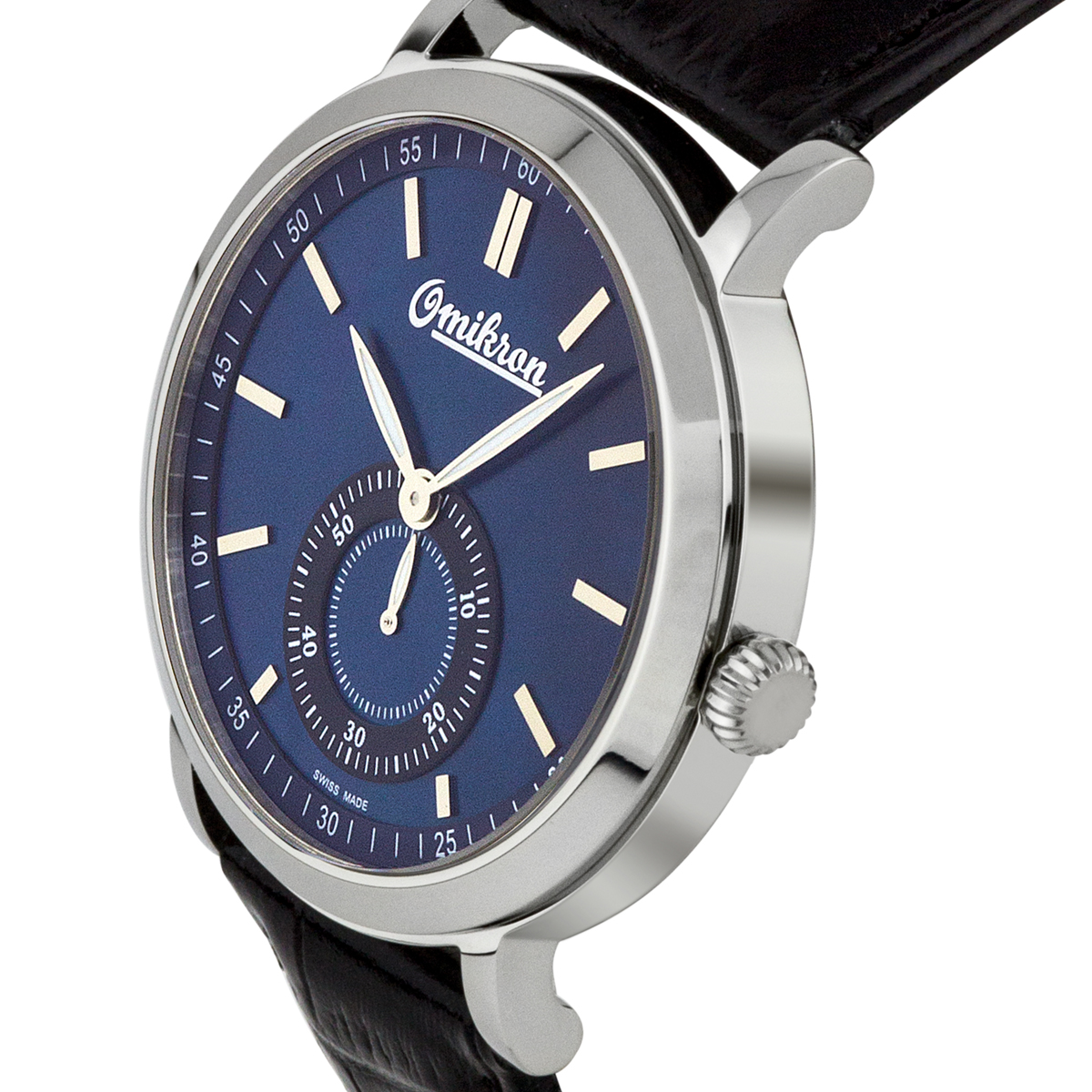 The Omikron Harrier Men's Vintage Style Watch features a black leather strap, silver case, and blue mother-of-pearl dial. Please see photos for details.