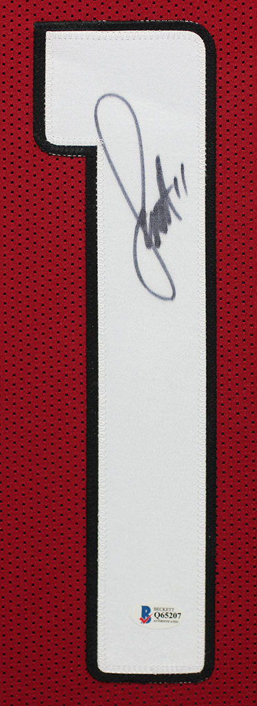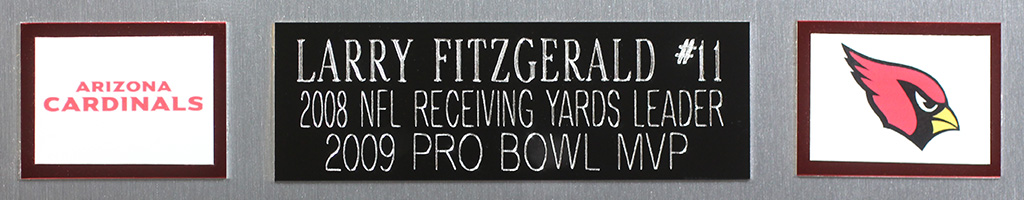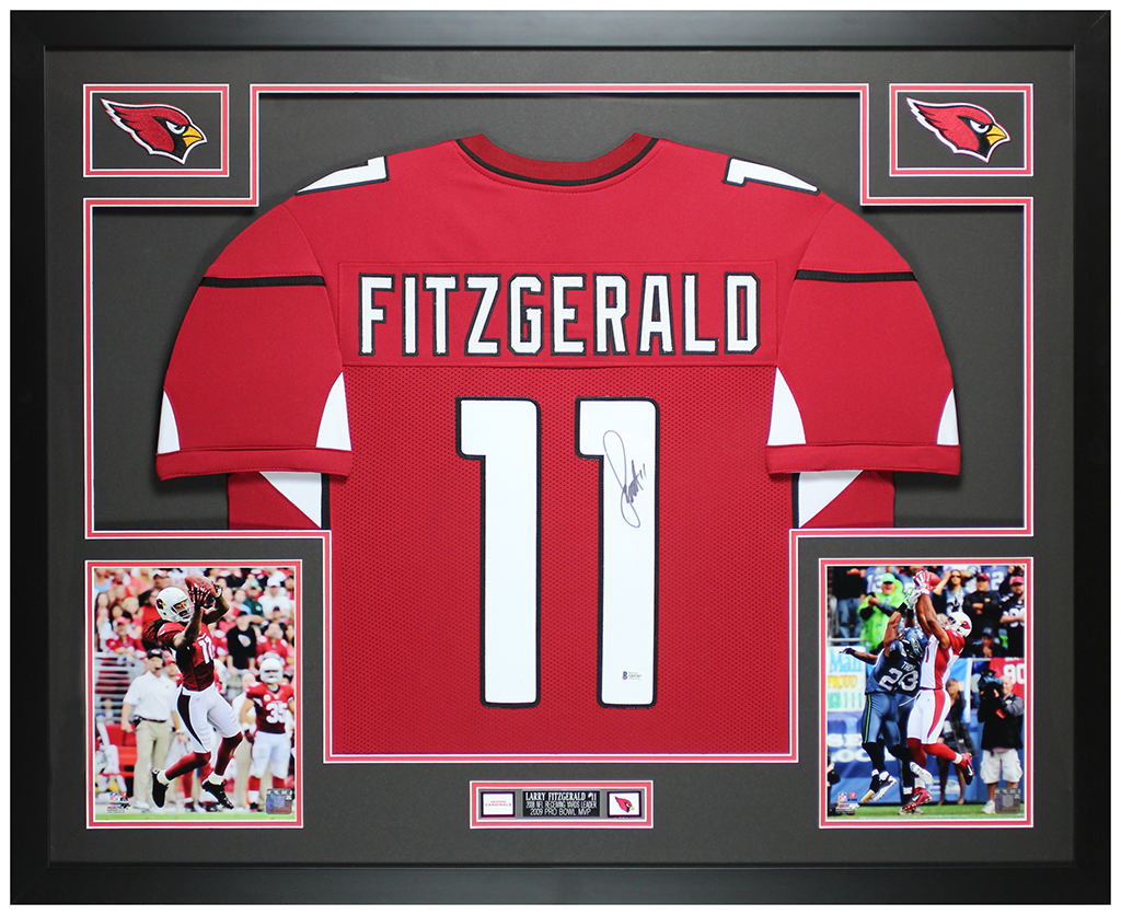 Custom frame measures 35" x 43" in size and features a jersey that has been hand-signed in black felt-tip pen by Larry Fitzgerald.