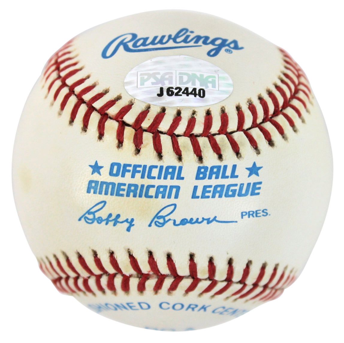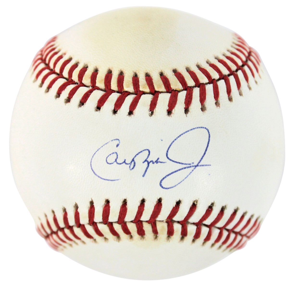 Rawlings Official American League baseball. Hand-signed in blue ink pen by Cal Ripken Jr. (Baltimore Orioles, HOF). Please note, baseball shows signs of natural toning.