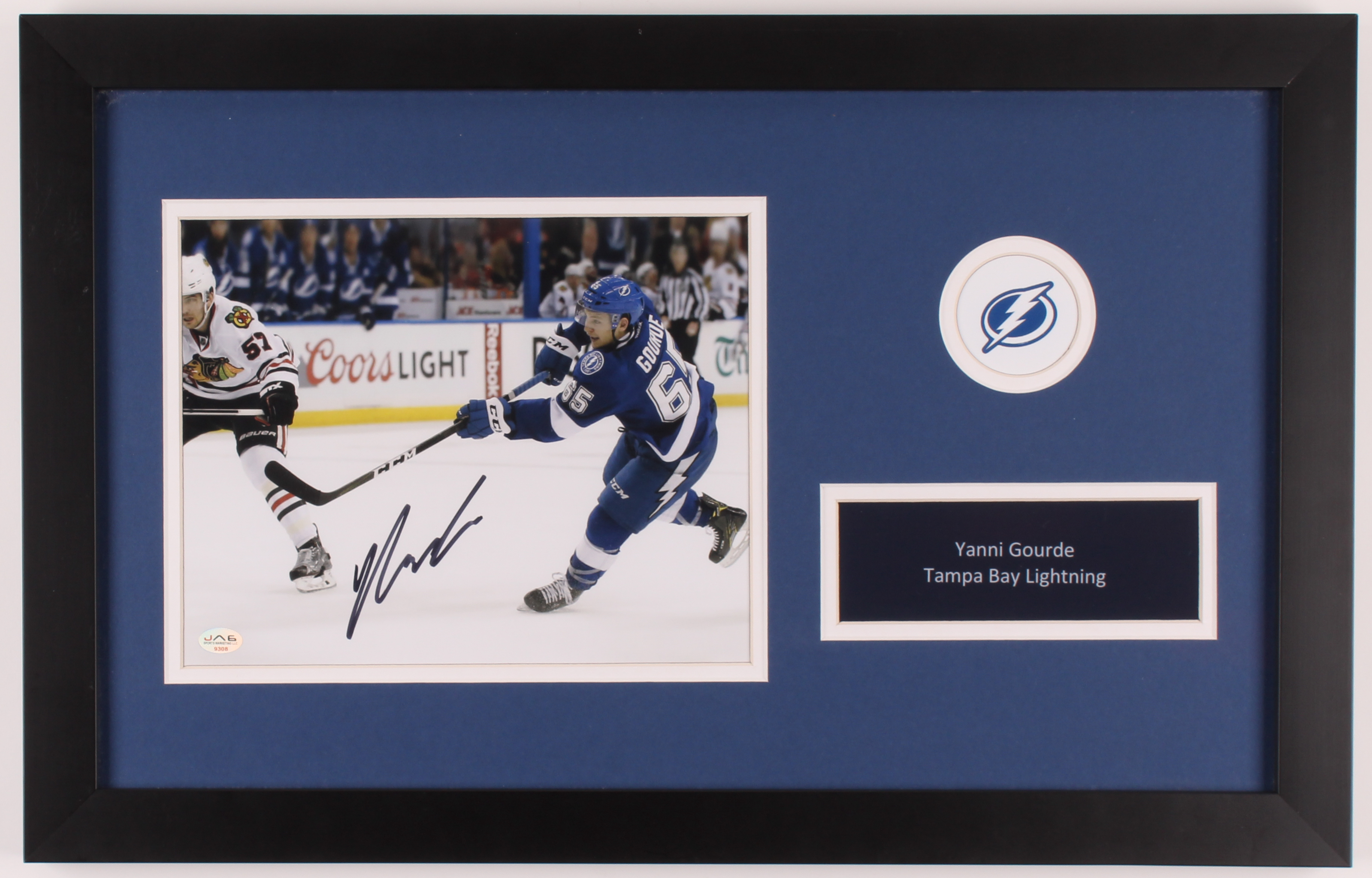 Custom frame measures 14" x 22" in size and has been hand-signed in black felt tip pen by Yanni Gourde (Tampa Bay Lightning).