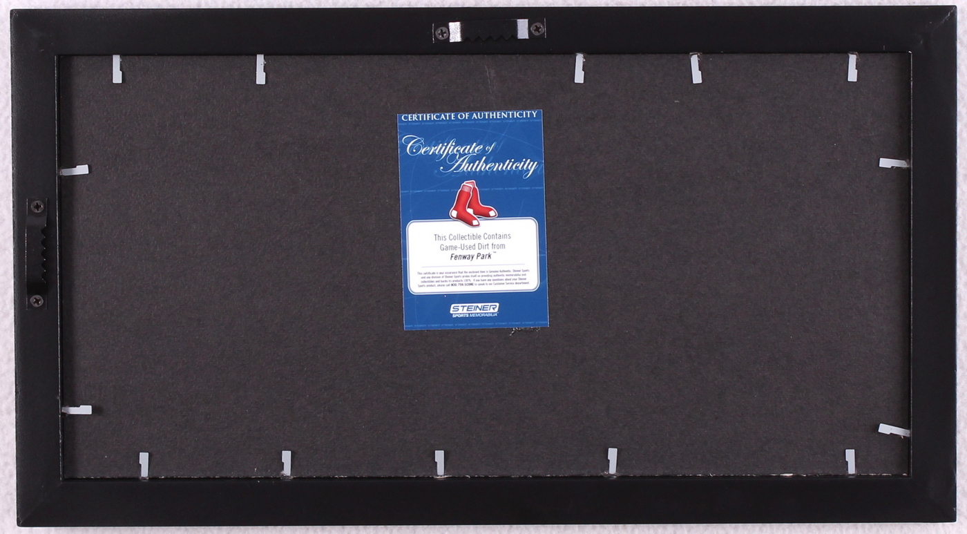 Red Sox custom framed display measures approximately 7.5" x 13.5" and contains authentic game-used dirt from Fenway Park. This dirt is certified authentic and comes complete with a MLB Authentication Hologram. Also includes a Steiner Sports COA.