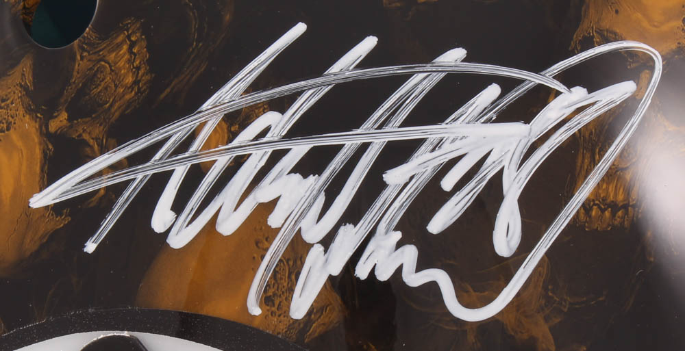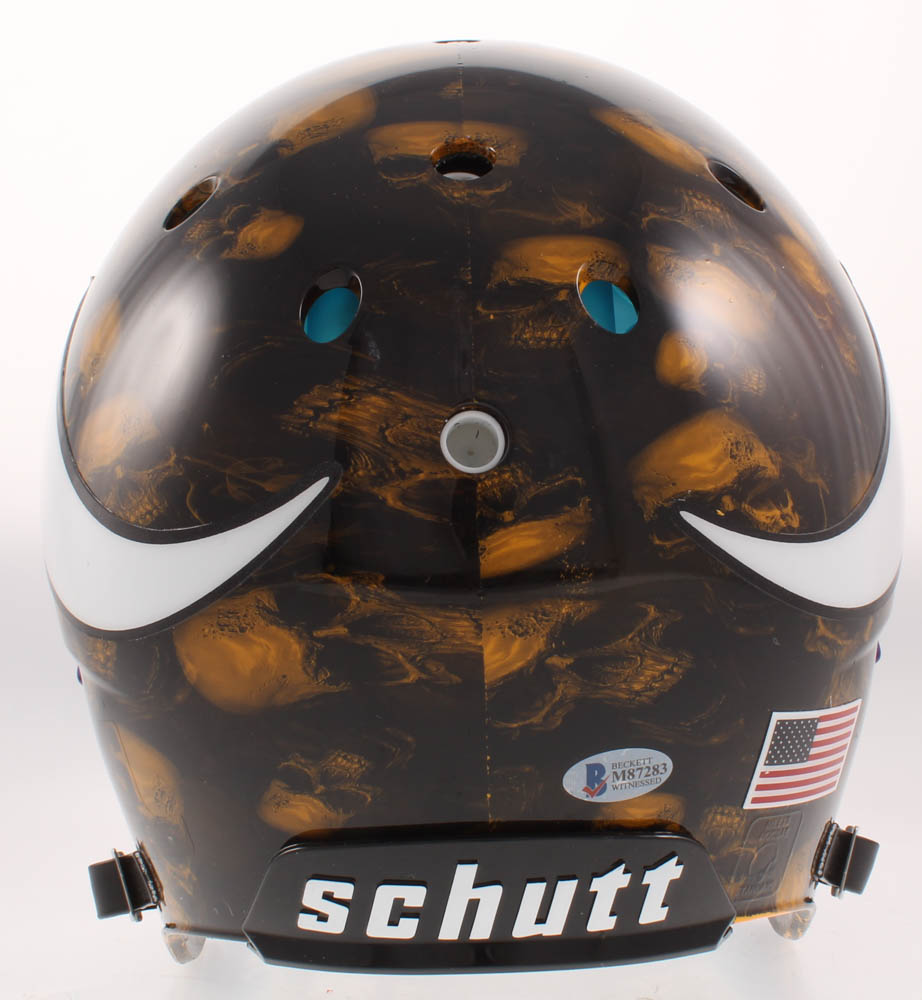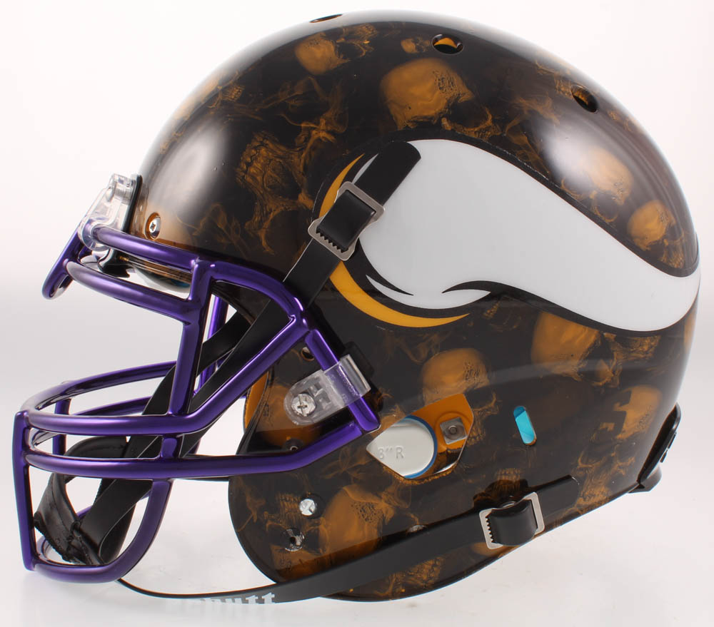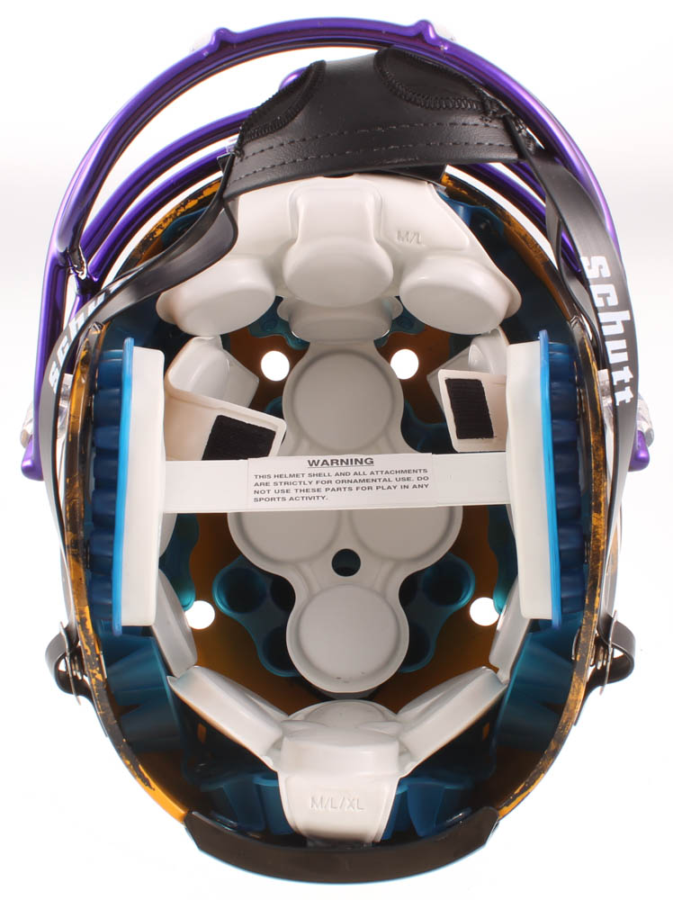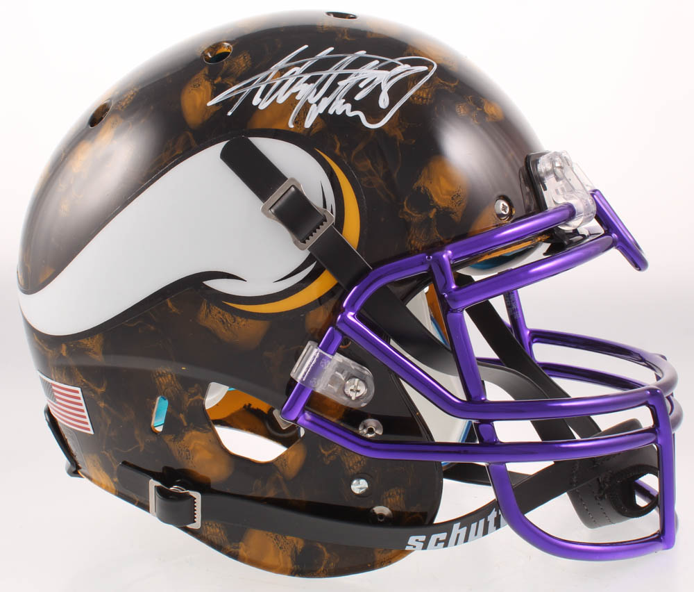 Schutt Minnesota Vikings full-size authentic on-field hydro-dipped helmet. Hand-signed in white paint pen by Adrian Peterson.