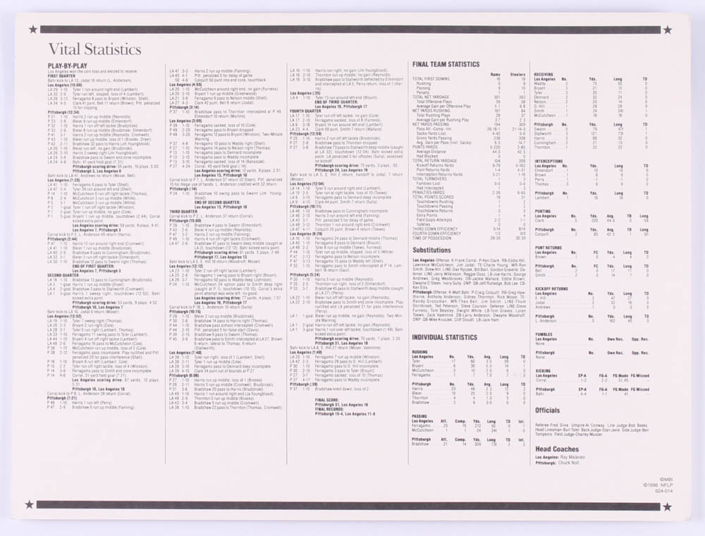 Official scorecard measures 9" x 12" in size and features a Pittsburgh Steelers vs Los Angeles Rams Super Bowl XIV patch.