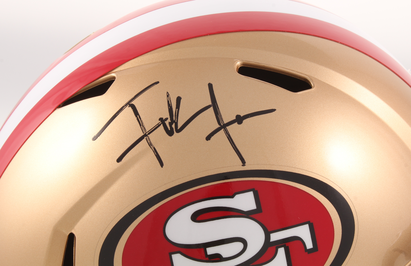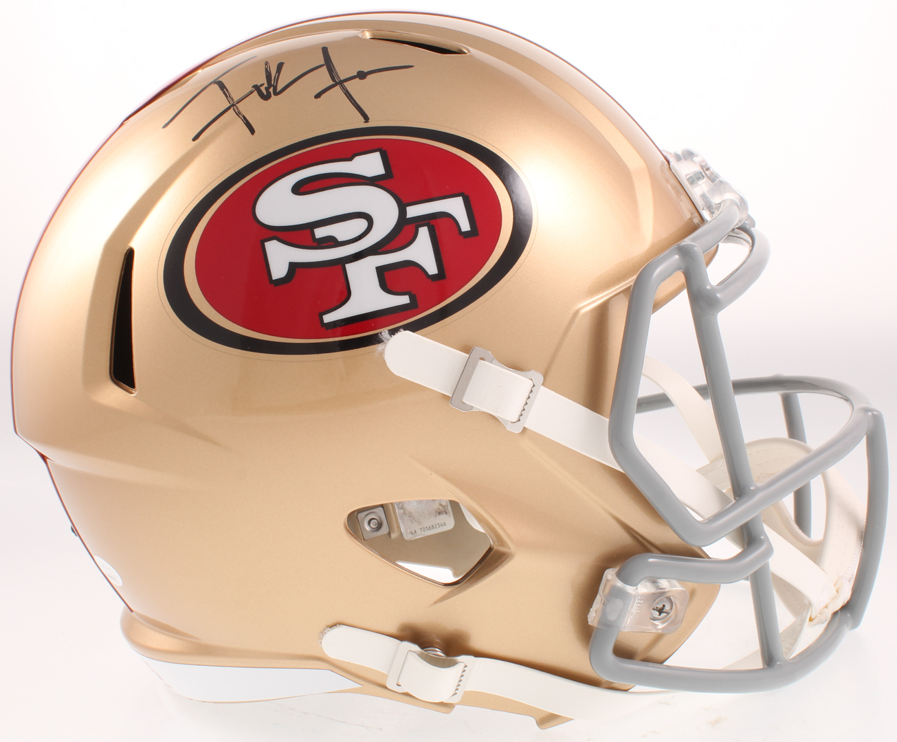 Riddell San Francisco 49ers full-size replica Speed helmet. Hand-signed in black felt tip pen by Frank Gore.