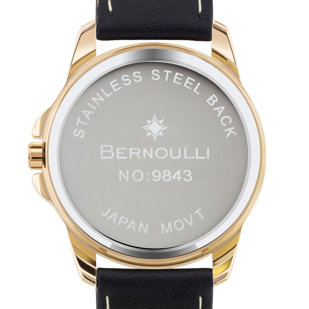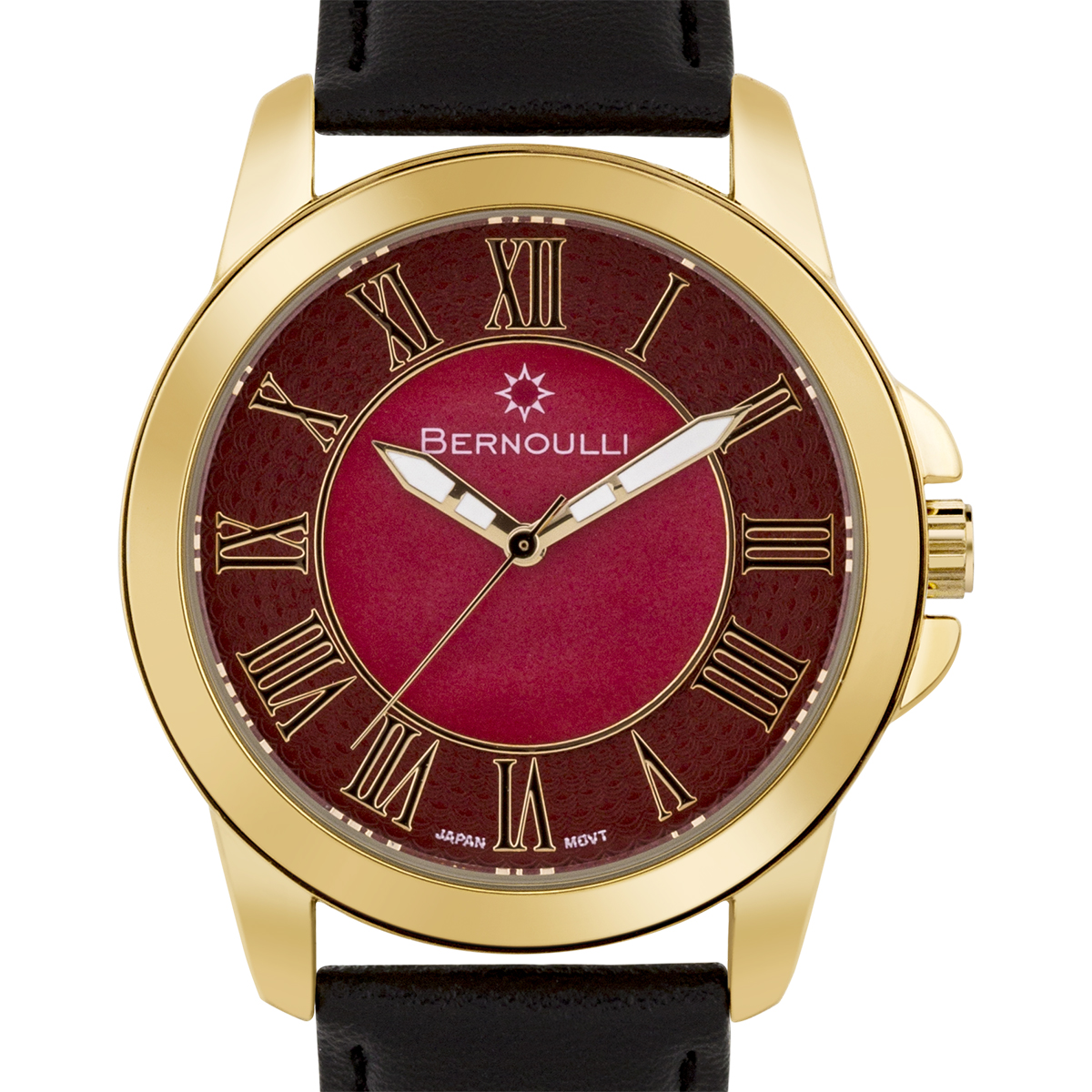The Bernoulli Faun II Ladies Watch features a black genuine leather strap, rose gold case, ruby red chapter ring, red pearl dial center, and rose gold indexes. Please see photos for details.