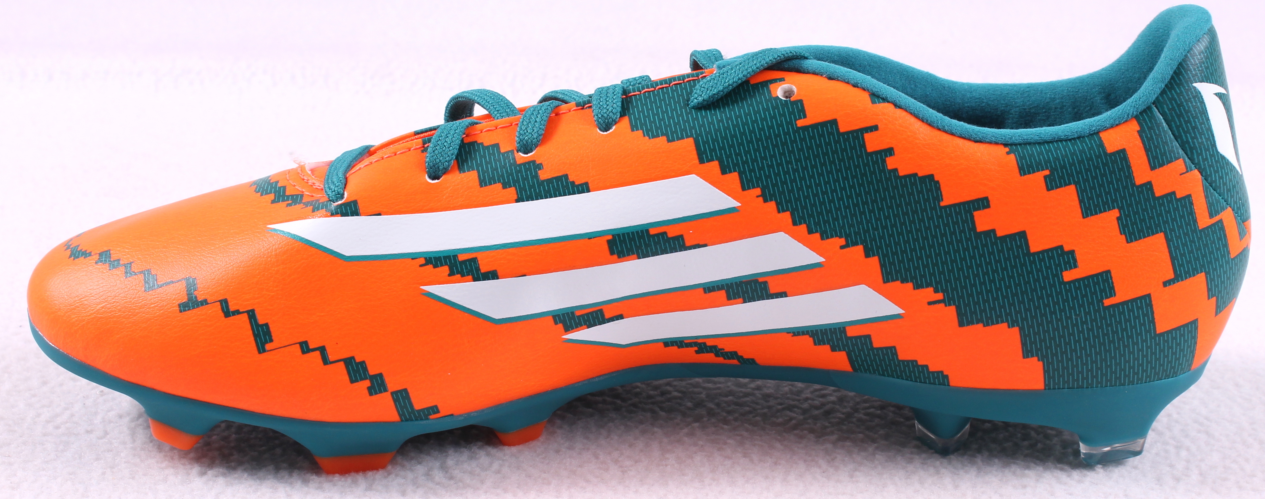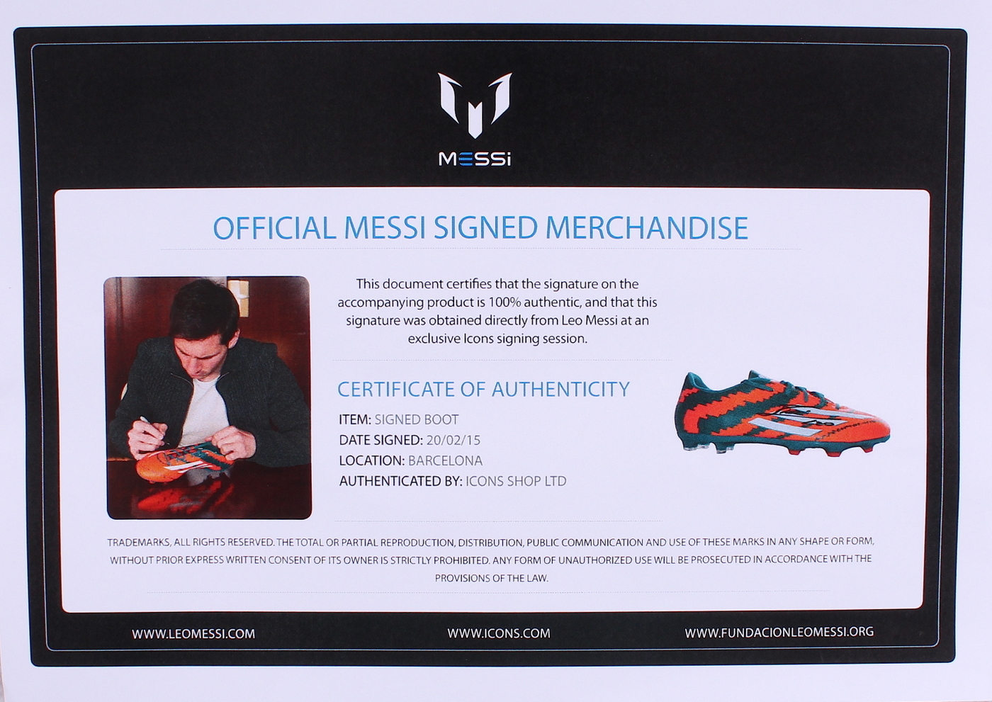 New Adidas soccer shoe / cleat, size 9. Hand-signed in black felt-tip pen by Lionel Messi. The autograph includes an official Lionel Messi COA for authenticity purposes.