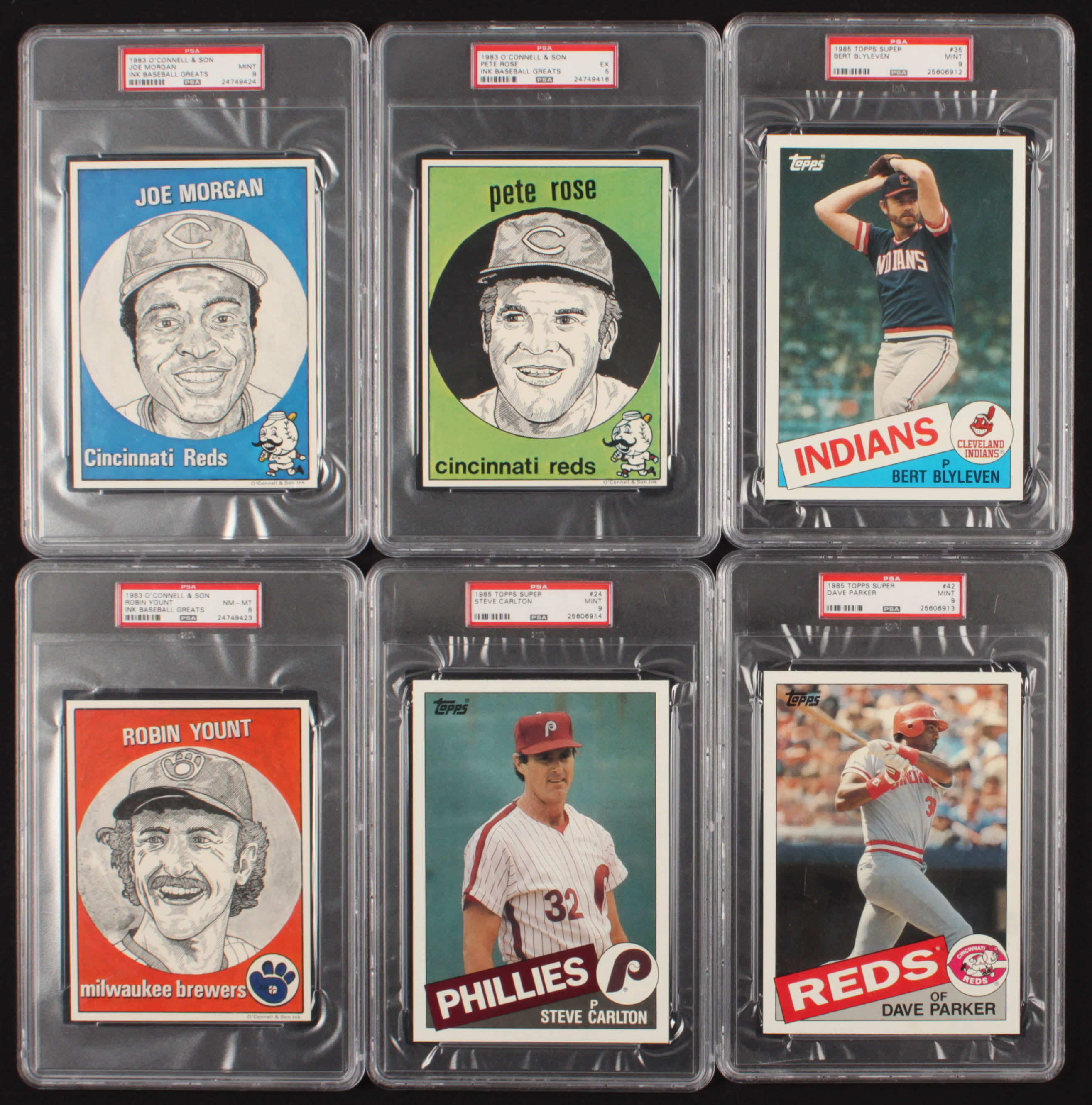 Lot of (6) PSA Graded Oversized Baseball Cards with Steve Carlton 1985 Topps Super #24 (PSA 9), Dave Parker 1985 Topps Super #42 (PSA 9), Bert Blyleven 1985 Topps Super #35 (PSA 9)