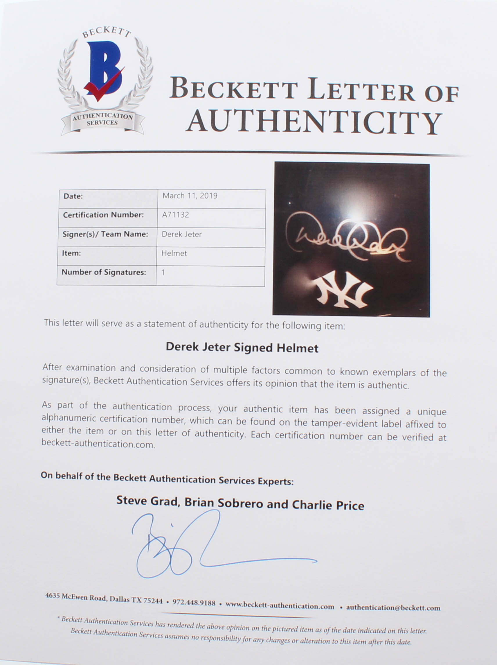 New York Yankees authentic ABC batting helmet has been hand-signed in silver paint pen by Derek Jeter (HOF).