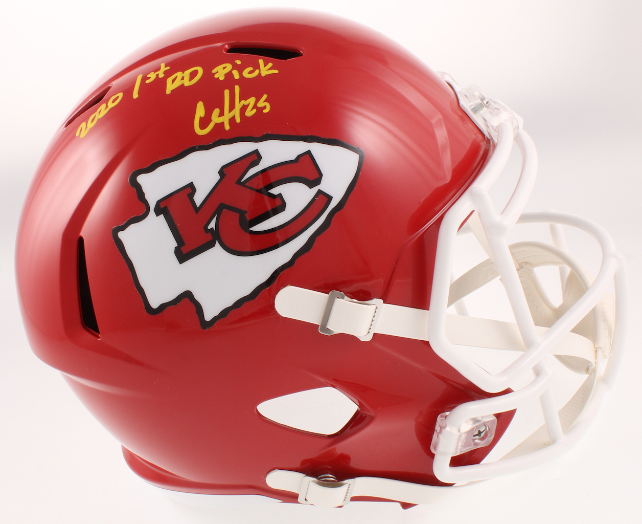 Riddell Kansas City Chiefs full-size replica speed helmet. Hand-signed in yellow paint pen by Clyde Edwards-Helaire.