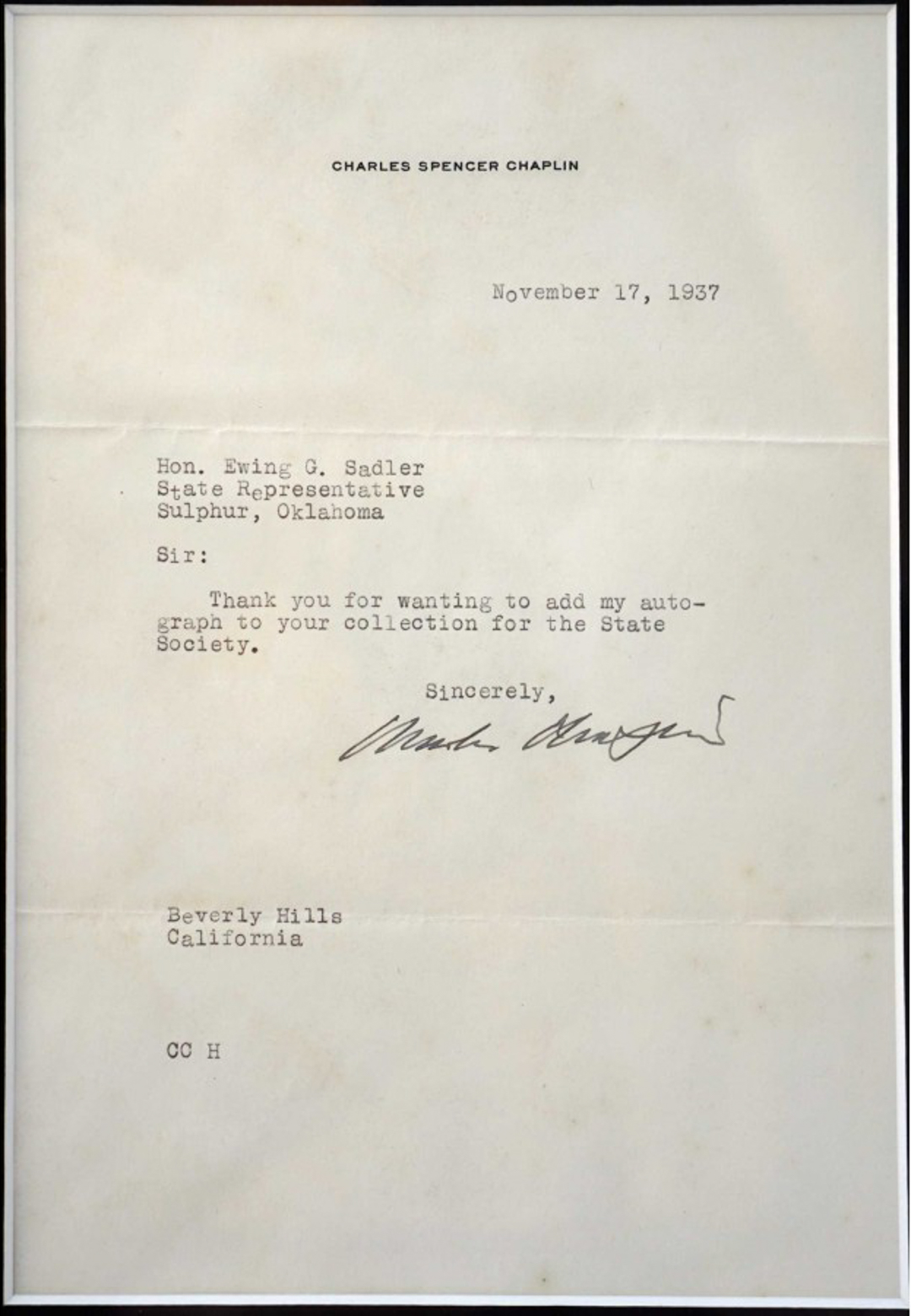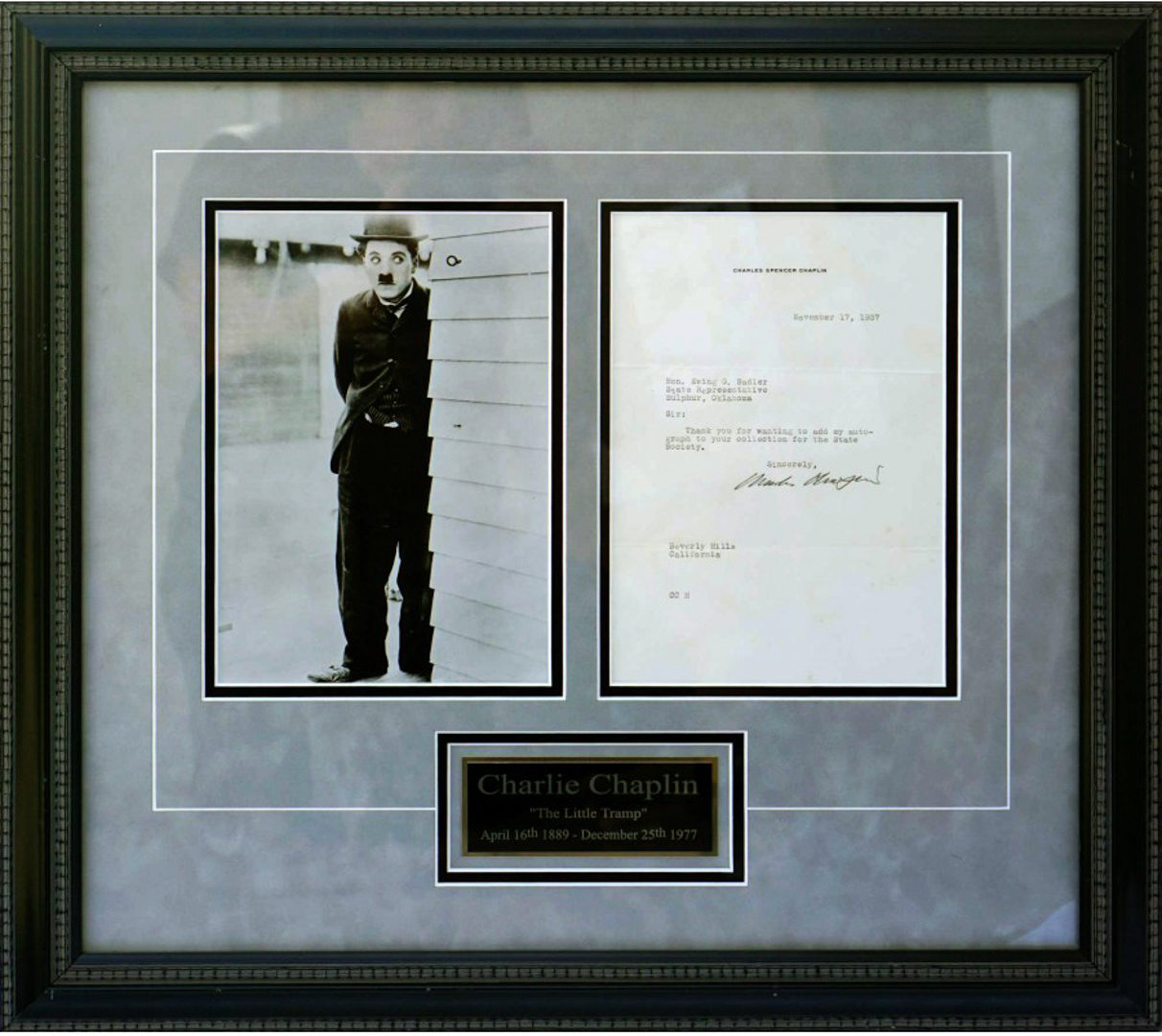 Custom frame measures 21" x 23" in size. Features a letter by famous silent film star Charlie Chaplin (D. 1977) is signed on black ink pen on his personal letterhead in response to an autograph request from a fan dated November 17, 1937.