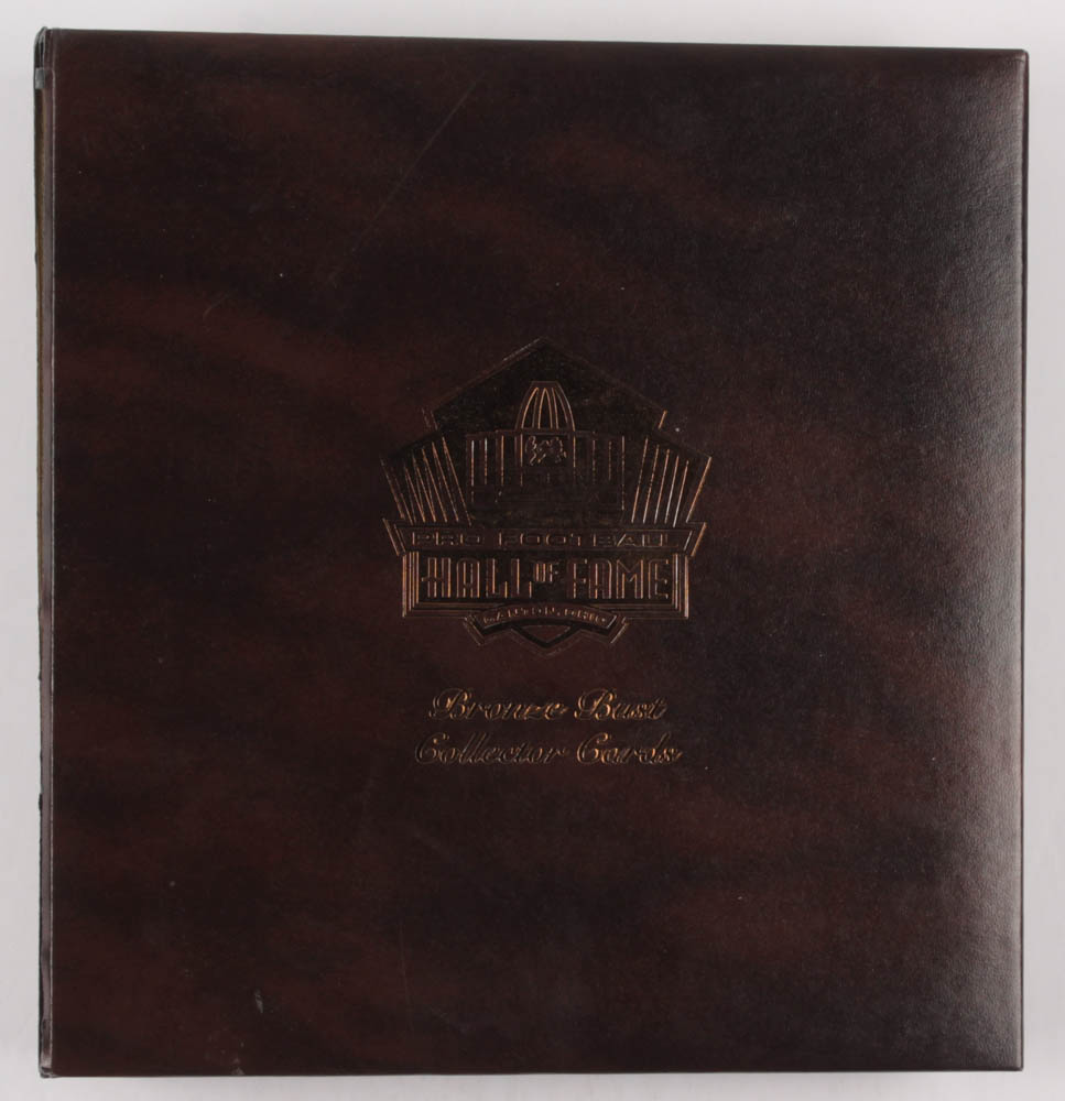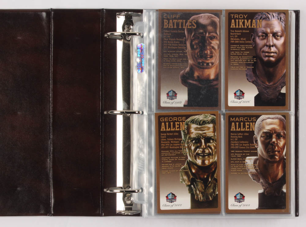 This limited edition Bronze Bust Collector Card set includes more than (135) hand-numbered cards depicting, in stunning high-resolution photography, the sculpted bronze portrait bust of each Hall of Fame member. Collector cards in each set of Hall of Famers, including Michael Irvin, Bart Starr, Johnny Unitas, Tom Landry, O.J. Simpson, Lawrence Taylor, Thurman Thomas and others. Set comes in a high quality display binder. Please see images for further details regarding condition.