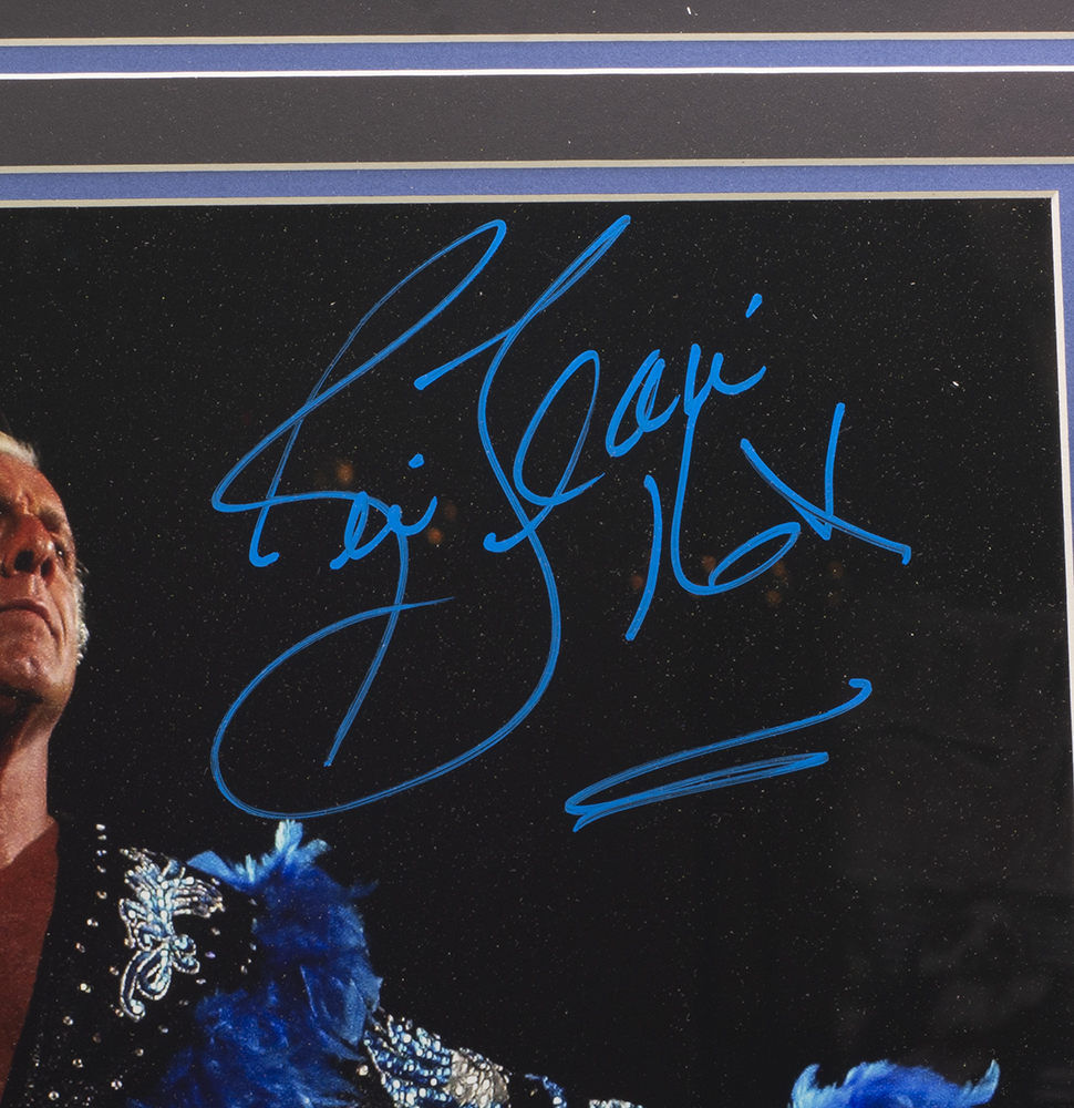 Custom framed display measures 22" x 26" in size and has been hand-signed and inscribed in blue paint pen by Ric Flair (HOF).