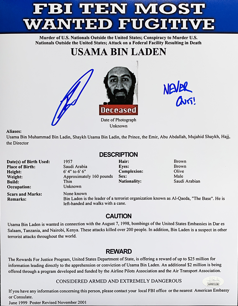 Robert O'Neill Signed "FBI Ten Most Wanted Fugitive" 11x14 Photo Inscribed "Never Quit!" (JSA COA)